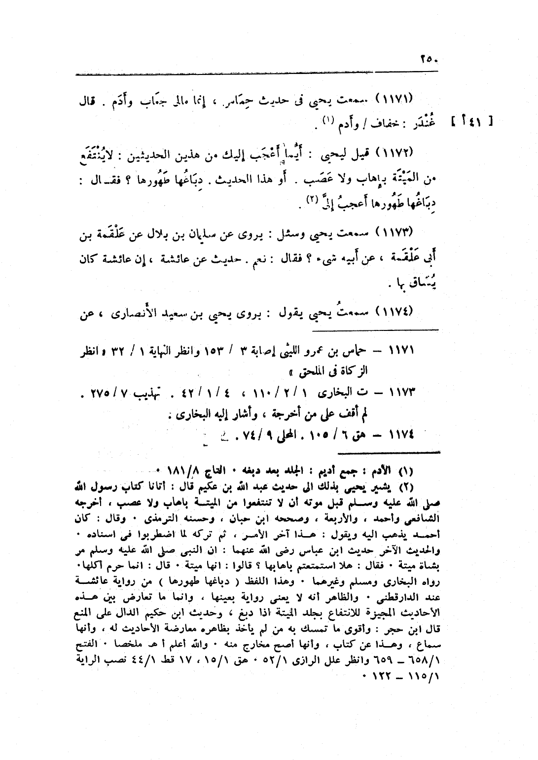 1172 - قيل ليحيى أَيّمَا أعجب إِلَيْك من هذَيْن الْحَدِيثين لَا ينْتَفع من الْميتَة بإهاب وَلَا عصب أَو هَذَا الحَدِيث دباغها طهورها فَقَالَ دباغها ظُهُورهَا أعجب إِلَى