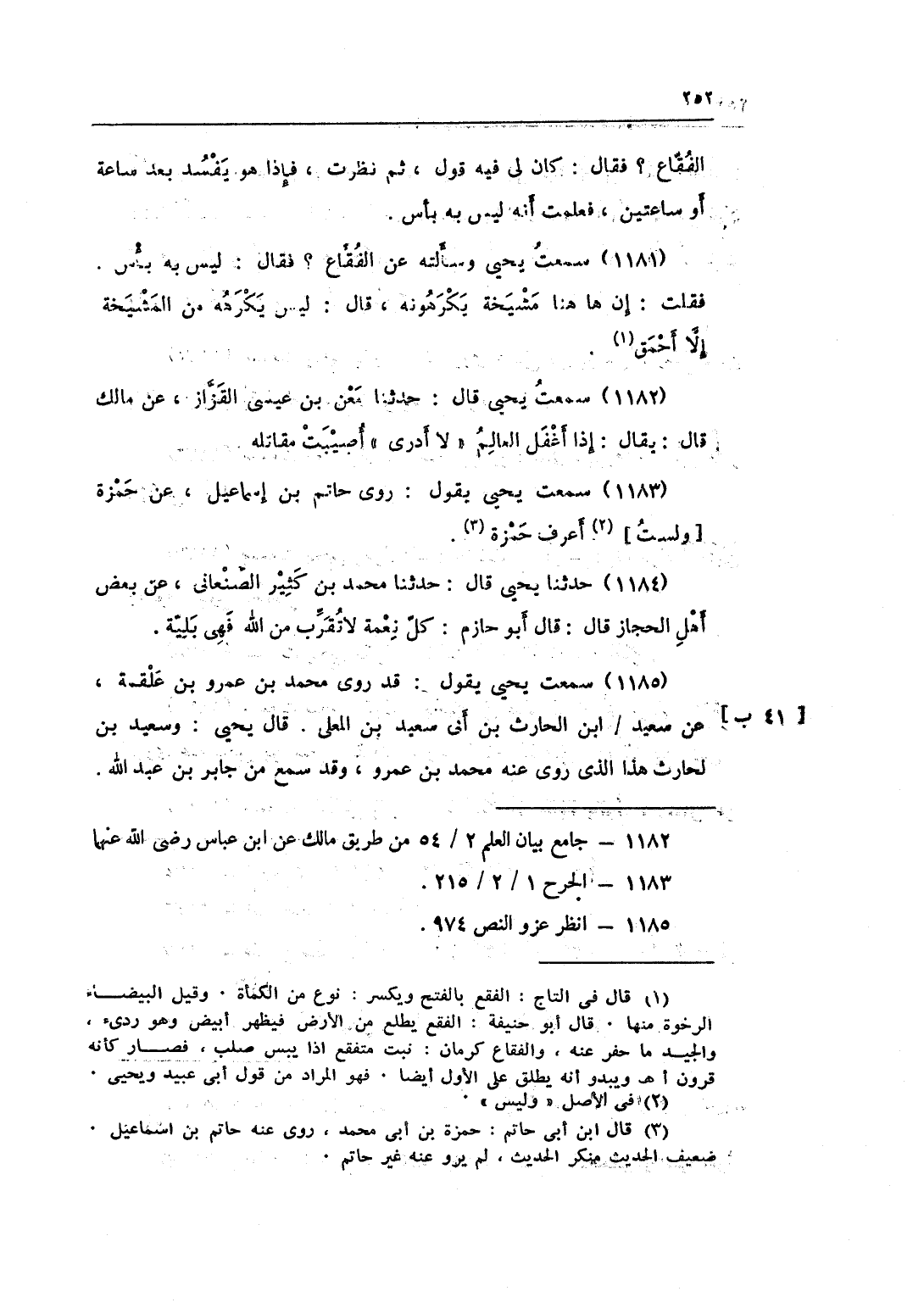 1181 - سَمِعت يحيى وَسَأَلته عَن الفقاع فَقَالَ لَيْسَ بِهِ بَأْس فَقلت إِن هَا هُنَا مشيخة يكرهونه قَالَ لَيْسَ يكرههُ من المشيخة إِلَّا أَحمَق