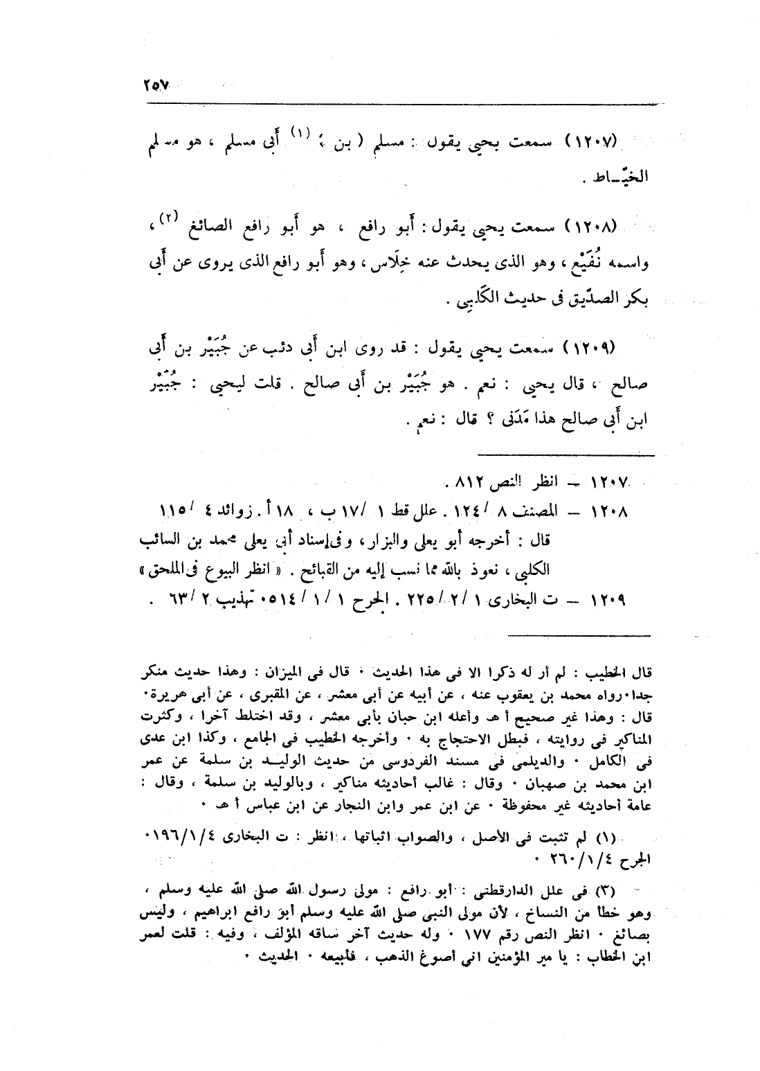 1208 - سَمِعت يحيى يَقُول أَبُو رَافع هُوَ أَبُو رَافع الصَّائِغ واسْمه نفيع وَهُوَ الَّذِي يحدث عَنهُ خلاس وَهُوَ أَبُو رَافع الَّذِي يرْوى عَن أَبى بكر الصّديق فِي حَدِيث الْكَلْبِيّ