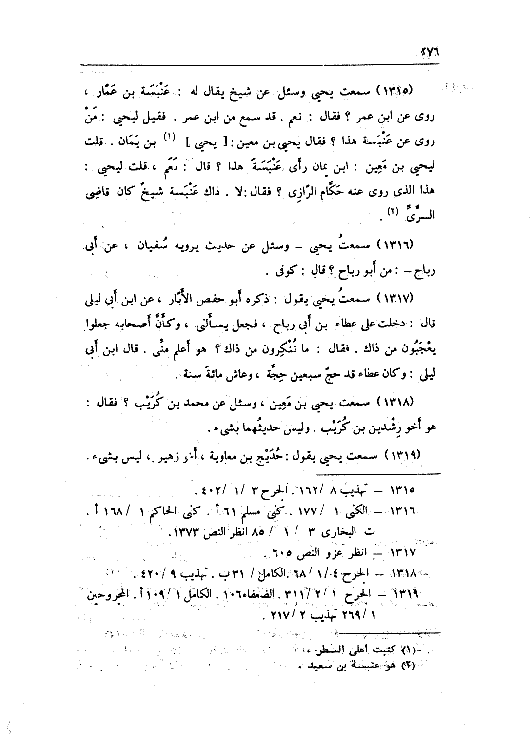 1315 - سَمِعت يحيى وَسُئِلَ عَن شيح يُقَال لَهُ عَنْبَسَة بن عمار روى عَن بن عمر فَقَالَ نعم قد سمع من بن عمر فَقيل ليحيى من روى عَن عَنْبَسَة هَذَا فَقَالَ يحيى بن معِين يحيى بن يمَان قلت ليحيى بن معِين بن يمَان رأى عَنْبَسَة هَذَا قَالَ نعم قلت ليحيى هَذَا الَّذِي روى عَنهُ حكام الرَّازِيّ فَقَالَ لَا ذَاك عَنْبَسَة شيخ كَانَ قاضى الرّيّ