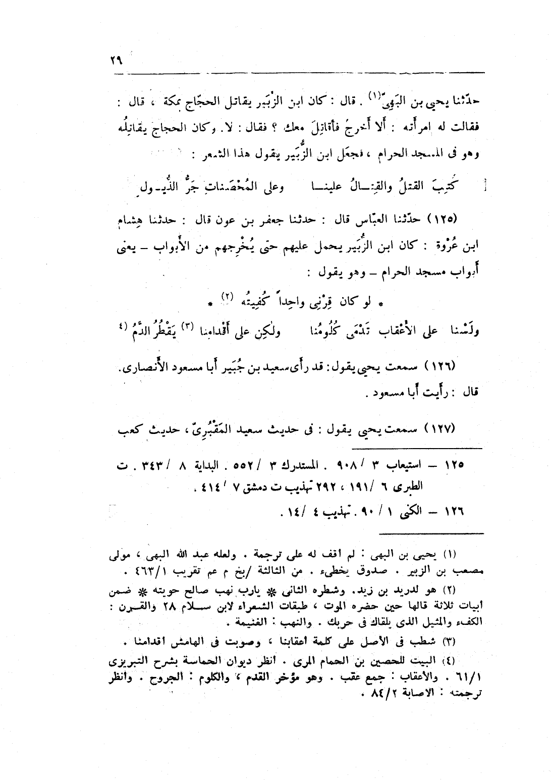 125 - حَدثنَا الْعَبَّاس قَالَ حَدثنَا جَعْفَر بن عون قَالَ حَدثنَا هِشَام بن عُرْوَة كَانَ بن الزبير يحمل عَلَيْهِم حَتَّى يخرجهم من الْأَبْوَاب يعْنى أَبْوَاب مَسْجِد الْحَرَام وَهُوَ يَقُول ... لَو كَانَ قرنى وَاحِدًا كفيته ... ... ... ولسنا على الأعقاب تدمى كلومنا ... وَلَكِن على أقدامنا يقطر الدَّم ...
