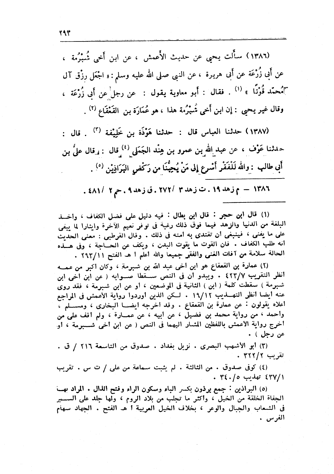 1386 - سَأَلت يحيى عَن حَدِيث الْأَعْمَش عَن بن أخى شبْرمَة عَن أَبى زرْعَة عَن أَبى هُرَيْرَة عَن النَّبِي صلى الله عَلَيْهِ وَسلم اجْعَل رزق آل مُحَمَّد قوتا فَقَالَ أَبُو مُعَاوِيَة يَقُول عَن رجل عَن أَبى زرْعَة وَقَالَ غير يحيى إِن بن أخى شبْرمَة هَذَا هُوَ عمَارَة بن الْقَعْقَاع