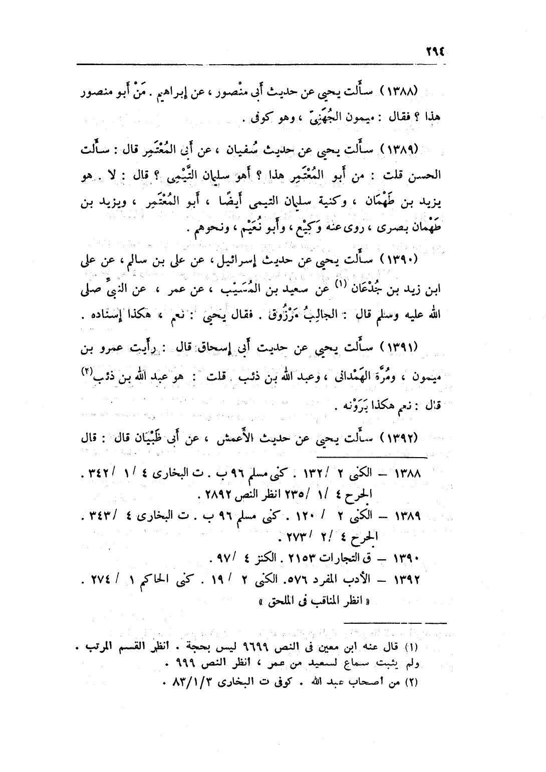 1389 - سَأَلت يحيى عَن حَدِيث سُفْيَان عَن أَبى الْمُعْتَمِر قَالَ سَأَلت الْحسن قلت من أَبُو الْمُعْتَمِر هَذَا أهوَ سُلَيْمَان التيمى قَالَ لَا هُوَ يزِيد بن طهْمَان وكنية سُلَيْمَان التيمى أَيْضا أَبُو الْمُعْتَمِر وَيزِيد بن طهْمَان بصرى روى عَنهُ وَكِيع وَأَبُو نعيم وَنَحْوهم