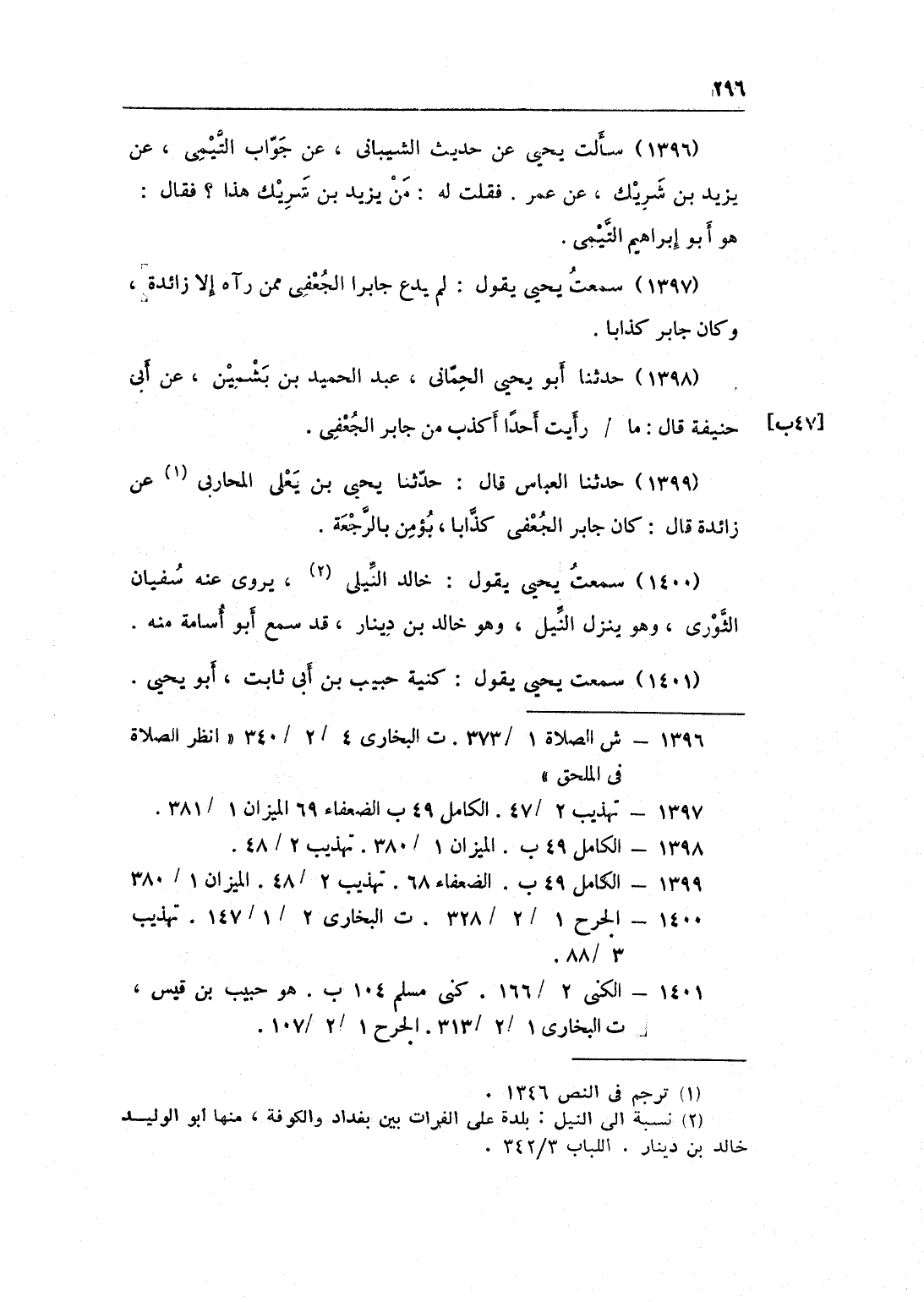 1400 - سَمِعت يحيى يَقُول خَالِد النيلى يرْوى عَنهُ سُفْيَان الثَّوْريّ وَهُوَ ينزل النّيل وَهُوَ خَالِد بن دِينَار قد سمع أَبُو أُسَامَة مِنْهُ