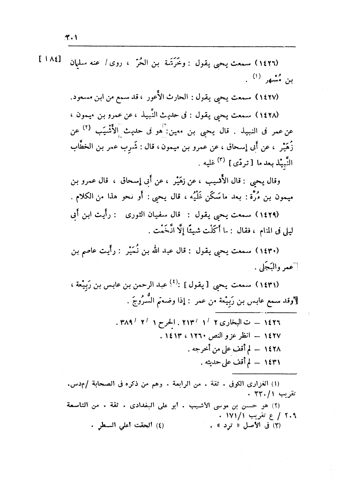 1428 - سَمِعت يحيى يَقُول فِي حَدِيث النَّبِيذ عَن عَمْرو بن مَيْمُون عَن عمر فِي النَّبِيذ قَالَ يحيى بن معِين هُوَ فِي حَدِيث الأشيب عَن زُهَيْر عَن أَبى إِسْحَاق عَن عَمْرو بن مَيْمُون قَالَ شرب عمر بن الْخطاب النَّبِيذ بعد مَا تردى غليه وَقَالَ يحيى قَالَ الأشيب عَن زُهَيْر عَن أَبى إِسْحَاق قَالَ عَمْرو بن مَيْمُون بن مرّة بعد مَا سكن غليه قَالَ يحيى أَو نَحْو هَذَا من الْكَلَام