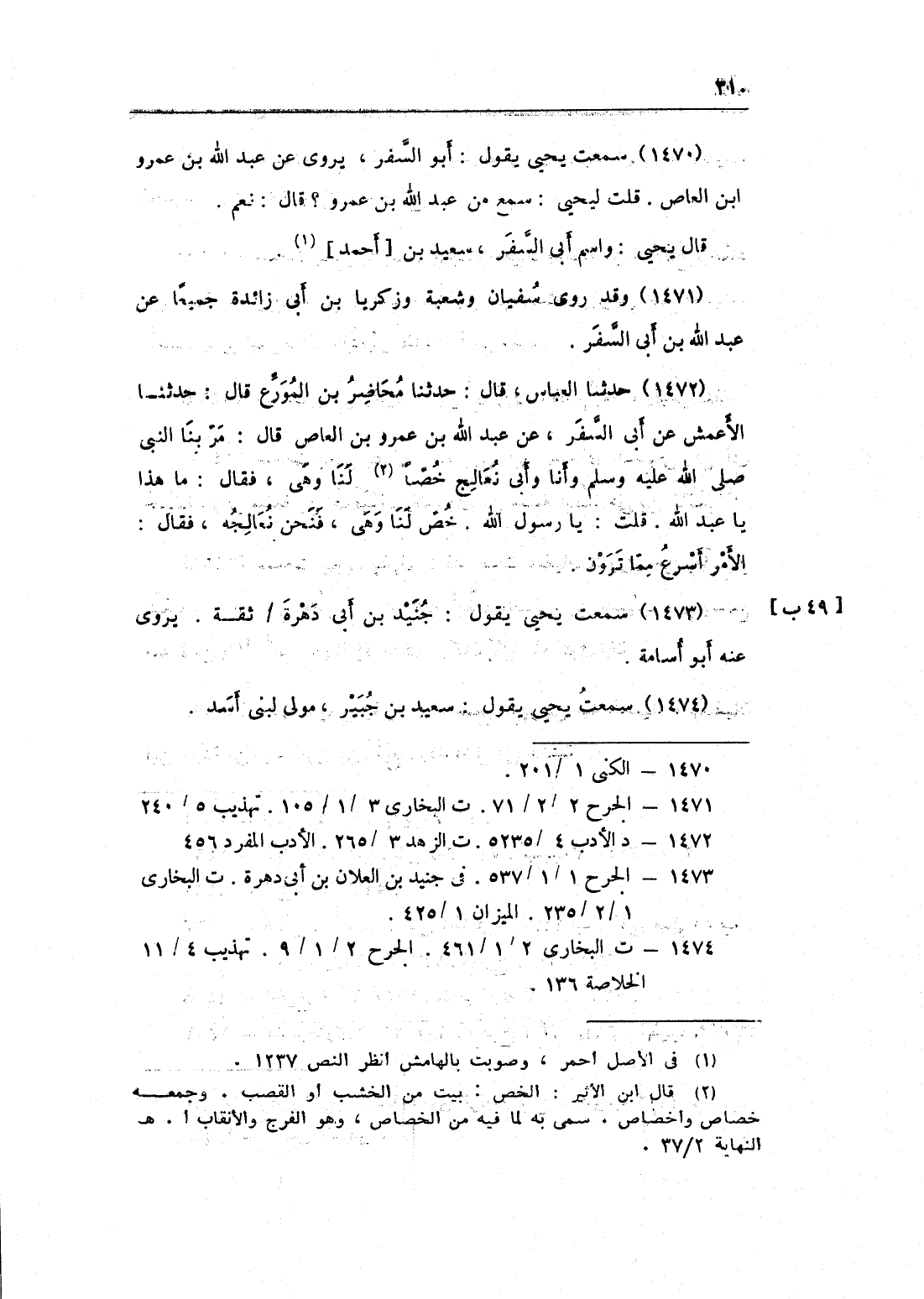 1470 - سَمِعت يحيى يَقُول أَبُو السّفر يرْوى عَن عبد الله بن عَمْرو بن الْعَاصِ قلت ليحيى سمع من عبد الله بن عَمْرو قَالَ نعم قَالَ يحيى وَاسم أَبى السّفر سعيد بن أَحْمد