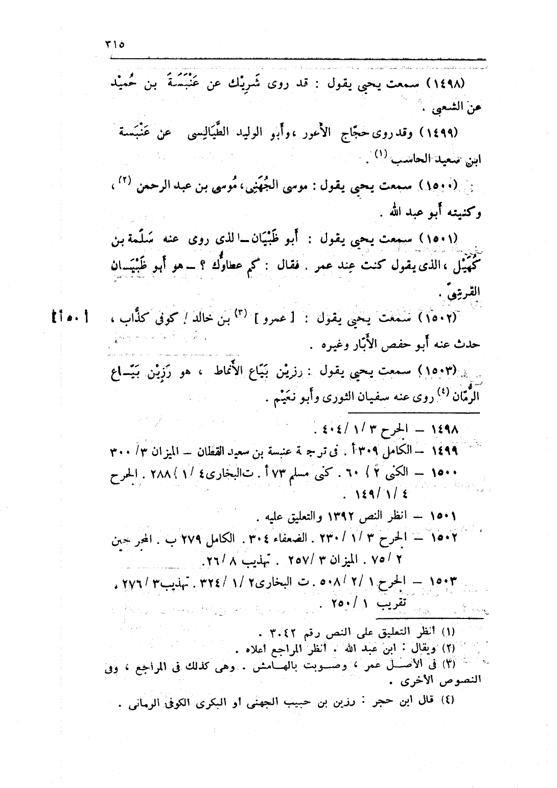 1501 - سَمِعت يحيى يَقُول أَبُو ظبْيَان الَّذِي روى عَنهُ سَلمَة بن كهيل الَّذِي يَقُول كنت عِنْد عمر فَقَالَ كم عطاؤك هُوَ أَبُو ظبْيَان الْقرشِي