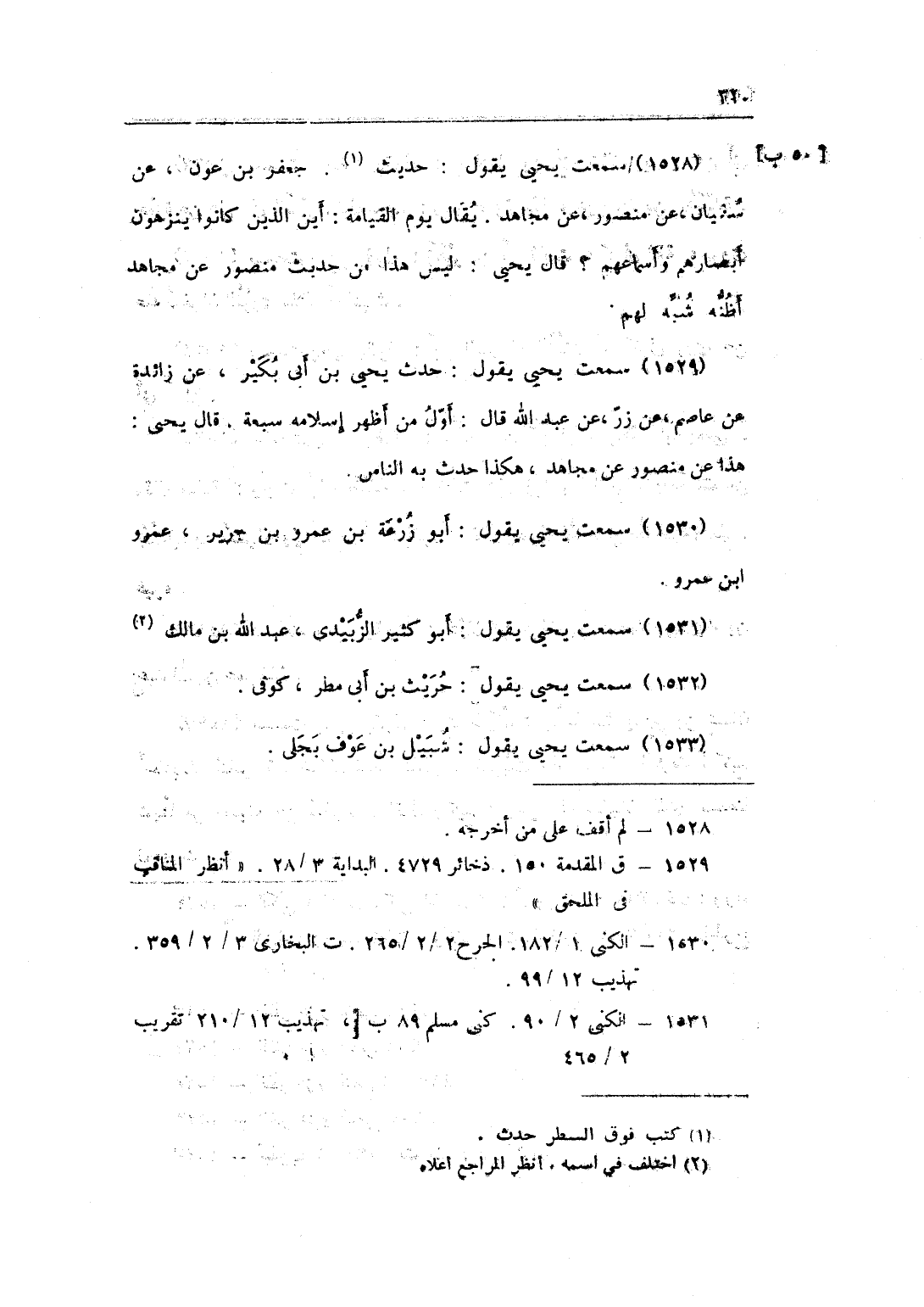1528 - سَمِعت يحيى يَقُول حَدِيث جَعْفَر بن عون عَن سُفْيَان عَن مَنْصُور عَن مُجَاهِد يُقَال يَوْم الْقِيَامَة أَيْن الَّذين كَانُوا ينزهون أَبْصَارهم وأسماعهم قَالَ يحيى لَيْسَ هَذَا من حَدِيث مَنْصُور عَن مُجَاهِد أَظُنهُ شبه لَهُم