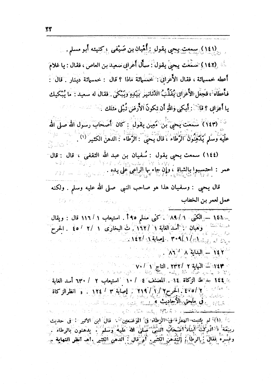 143 - سَمِعت يحيى بن معِين يَقُول كَانَ أَصْحَاب رَسُول الله صلى الله عَلَيْهِ وَسلم يدهنون الرطاء قَالَ يحيى الرطاء الدّهن الْكثير