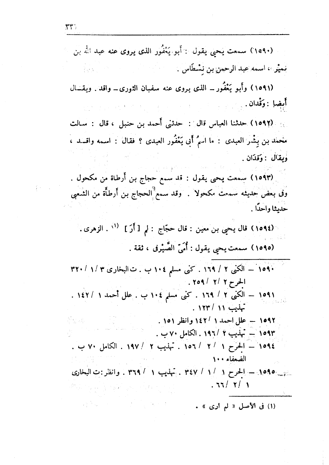 1593 - سَمِعت يحيى يَقُول قد سمع حجاج بن أَرْطَاة من مَكْحُول وفى بعض حَدِيثه سَمِعت مَكْحُولًا وَقد سمع الْحجَّاج بن أَرْطَاة من الشّعبِيّ حَدِيثا وَاحِدًا