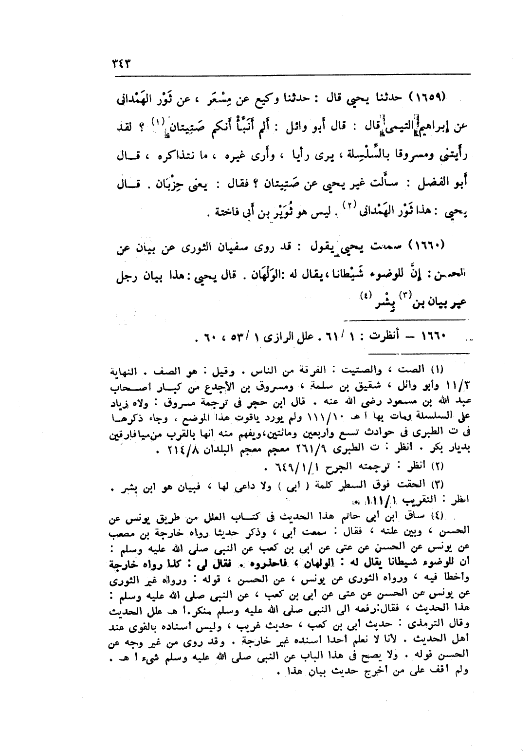 1659 - حَدثنَا يحيى قَالَ حَدثنَا وَكِيع عَن مسعر عَن ثَوْر الْهَمدَانِي عَن إِبْرَاهِيم التيمى قَالَ قَالَ أَبُو وَائِل ألم أنبأ أَنكُمْ صتيتان لقد رَأَيْتنِي ومسروقا بالسلسلة يرى رَأيا وَأرى غَيره مَا نتذاكره قَالَ أَبُو الْفضل سَأَلت غير يحيى عَن صتيتان فَقَالَ يعْنى حزبان قَالَ يحيى هَذَا ثَوْر الْهَمدَانِي لَيْسَ هُوَ ثُوَيْر بن أَبى فَاخِتَة