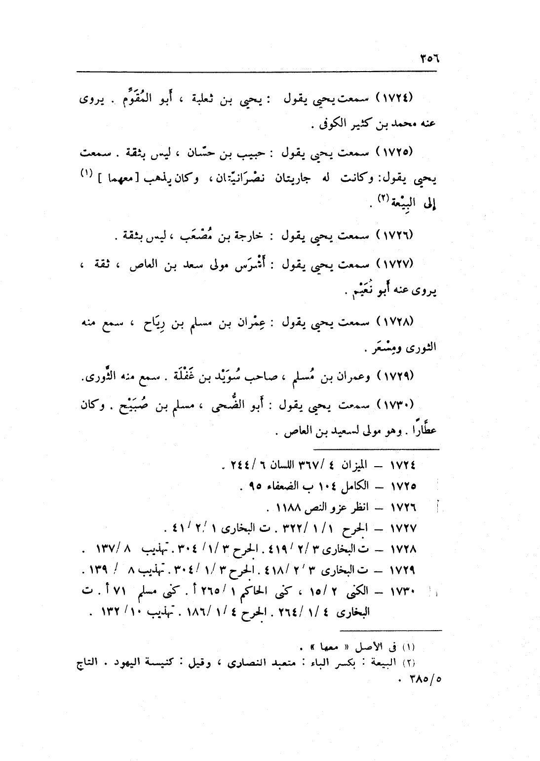 1725 - سَمِعت يحيى يَقُول حبيب بِي حسان لَيْسَ بِثِقَة سَمِعت يحيى يَقُول وَكَانَت لَهُ جاريتان نصرانيتان وَكَانَ يذهب مَعَهُمَا إِلَى الْبيعَة