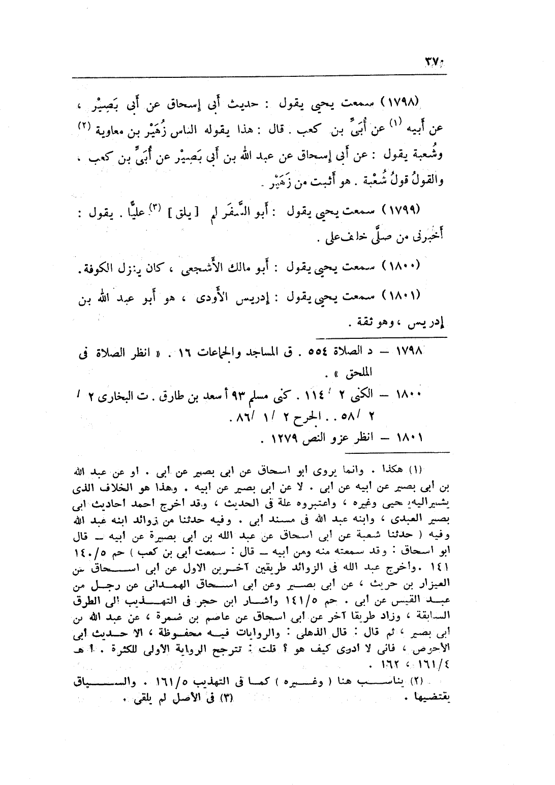 1798 - سَمِعت يحيى يَقُول حَدِيث أَبى إِسْحَاق عَن أَبى بَصِير عَن أَبِيه عَن أَبى بن كَعْب قَالَ هَذَا يَقُوله النَّاس زُهَيْر بن مُعَاوِيَة وَشعْبَة يَقُول عَن أَبى إِسْحَاق عَن عبد الله بن أَبى بَصِير عَن أَبى بن كَعْب وَالْقَوْل قَول شُعْبَة هُوَ أثبت من زُهَيْر