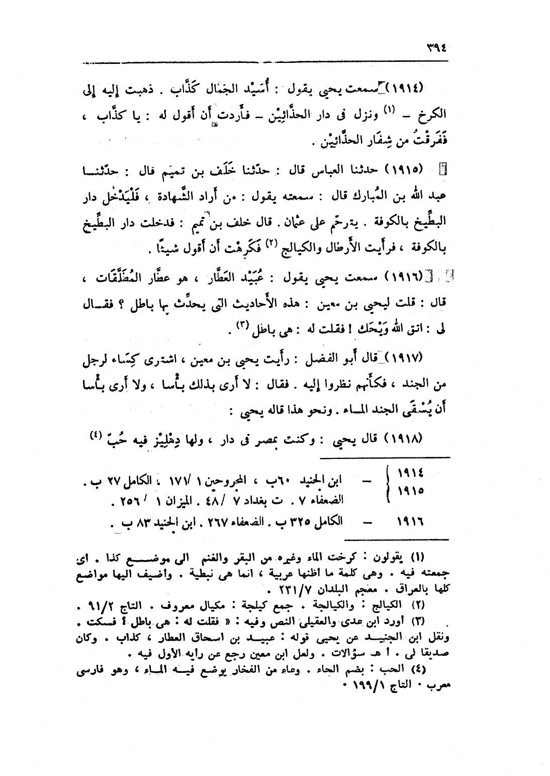 1914 - سَمِعت يحيى يَقُول أسيد الْجمال كَذَّاب ذهبت إِلَيْهِ إِلَى الكرخ وَنزل فِي دَار الحذائين فَأَرَدْت أَن أَقُول لَهُ يَا كَذَّاب ففرقت من شفار الحذائين