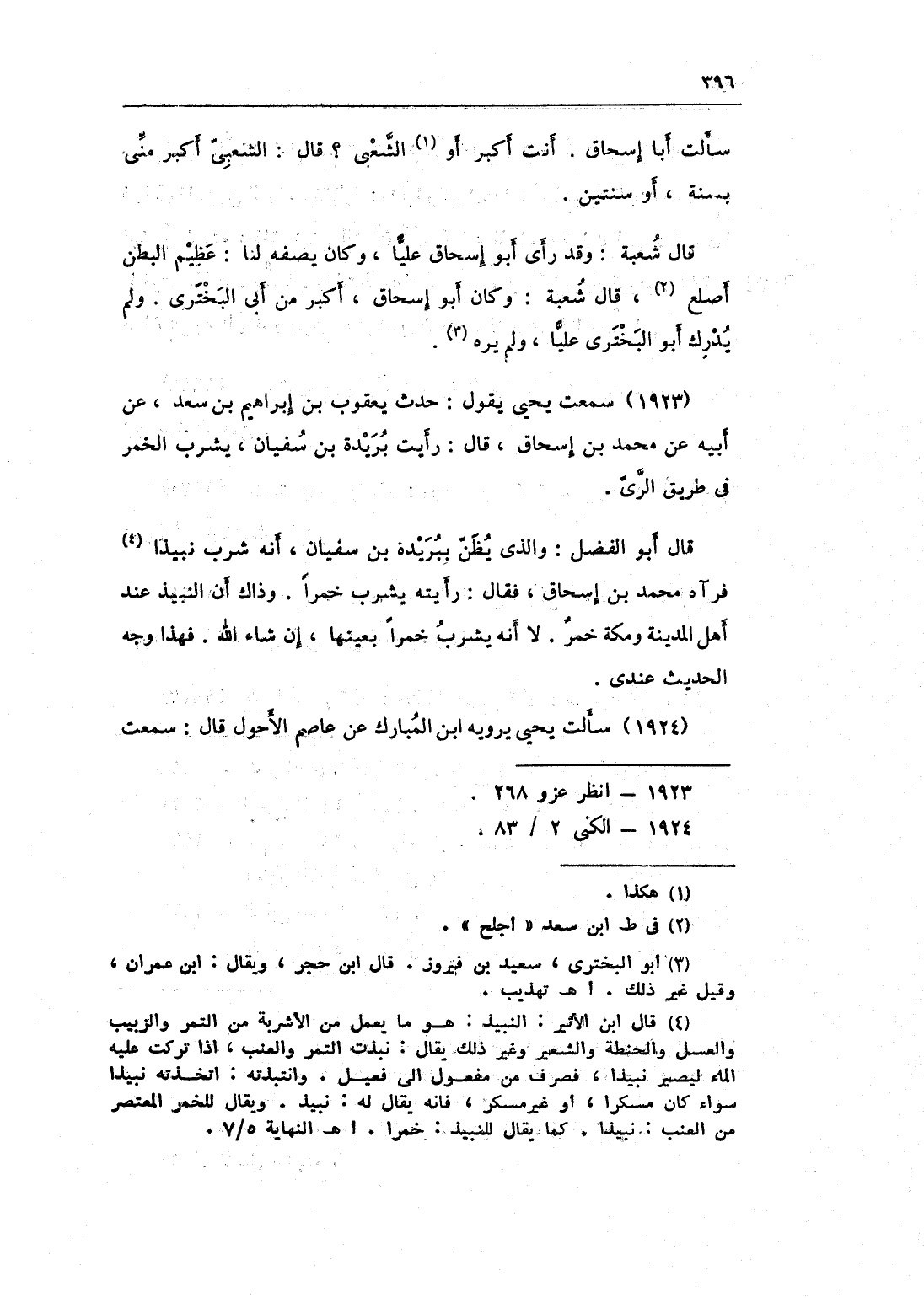 1923 - سَمِعت يحيى يَقُول حدث يَعْقُوب بن إِبْرَاهِيم بن سعد عَن أَبِيه عَن مُحَمَّد بن إِسْحَاق قَالَ رَأَيْت بُرَيْدَة بن سُفْيَان يشرب الْخمر فِي طَرِيق الرّيّ قَالَ أَبُو الْفضل وَالَّذِي يظنّ ببريدة بن سُفْيَان أَنه شرب نبيذا فَرَآهُ مُحَمَّد بن إِسْحَاق فَقَالَ رَأَيْته يشرب خمرًا وَذَاكَ أَن النَّبِيذ عِنْد أهل الْمَدِينَة وَمَكَّة خمر لَا أَنه يشرب خمرًا بِعَينهَا إِن شَاءَ الله فَهَذَا وَجه الحَدِيث عِنْدِي