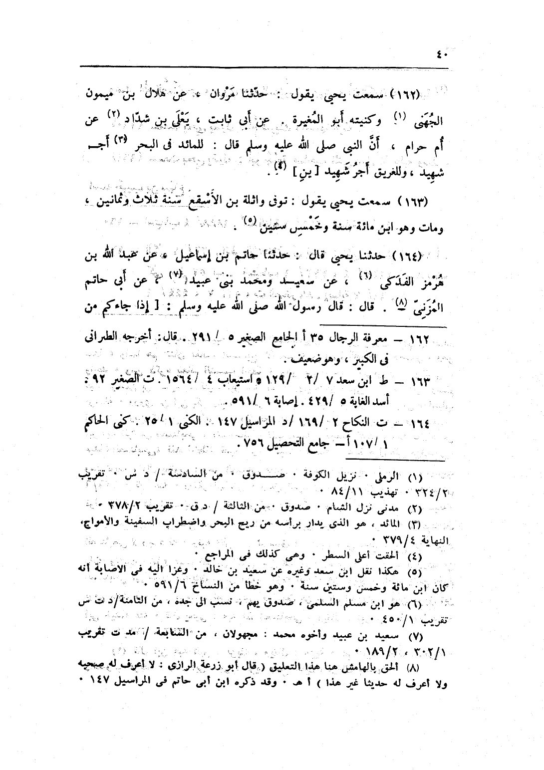 162 - سَمِعت يحيى يَقُول حَدثنَا مَرْوَان عَن هِلَال بن مَيْمُون الْجُهَنِيّ وكنيته أَبُو الْمُغيرَة عَن أَبى ثَابت يعلى بن شَدَّاد عَن أم حرَام أَن النَّبِي صلى الله عَلَيْهِ وَسلم قَالَ للمائد فِي الْبَحْر أجر شَهِيد وللغريق أجر شهيدين