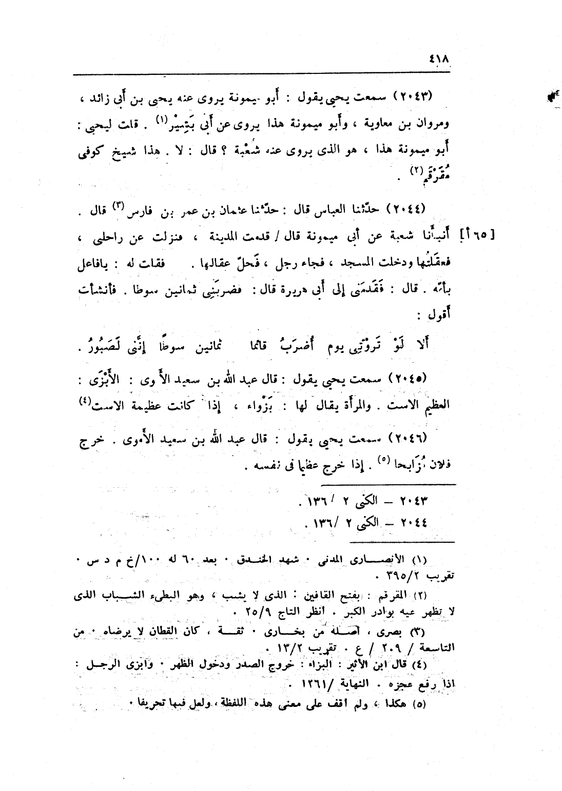 2043 - سَمِعت يحيى يَقُول أَبُو مَيْمُونَة يروي عَنهُ يحيى بن أَبى زَائِدَة ومروان بن مُعَاوِيَة وَأَبُو مَيْمُونَة هَذَا يرْوى عَن أَبى بشير قلت ليحيى أَبُو مَيْمُونَة هَذَا هُوَ الَّذِي يروي عَنهُ شُعْبَة قَالَ لَا هَذَا شيخ كوفى مقرقم