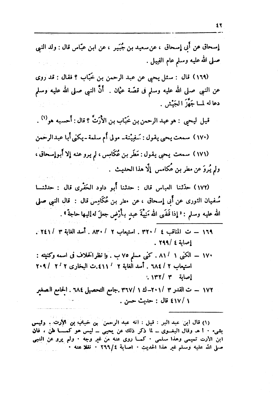 169 - قَالَ سُئِلَ يحيى عَن عبد الرَّحْمَن بن خباب فَقَالَ قد روى عَن النَّبِي صلى الله عَلَيْهِ وَسلم فِي قصَّة عُثْمَان أَن النَّبِي صلى الله عَلَيْهِ وَسلم دَعَا لَهُ لما جهز الْجَيْش قيل ليحيى هُوَ عبد الرَّحْمَن بن خباب بن الْأَرَت قَالَ أَحْسبهُ هُوَ