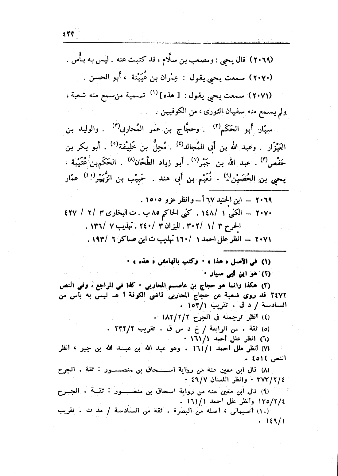 2071 - سَمِعت يحيى يَقُول هَذِه تَسْمِيَة من سمع مِنْهُ شُعْبَة وَلم يسمع مِنْهُ سُفْيَان الثَّوْريّ من الْكُوفِيّين سيار أَبُو الحكم وحجاج بن عمر الْمحَاربي والوليد بن الْعيزَار وَعبد الله بن أَبى المجالد مَحل بن خَليفَة أَبُو بكر بن حَفْص عبد الله بن جبر أَبُو زِيَاد الطَّحَّان الحكم بن عتيبة يحيى بن الْحصين نعيم بن أَبى هِنْد حبيب بن الزبير عمار الْعَبْسِي أَبُو معشر قلت ليحيى كم روى شُعْبَة عَن أَبى معشر قَالَ حديثين عَائِذ بن نصيب عقبَة بن حُرَيْث أَبُو الْمُخْتَار حَيَّان الْبَارِقي زَائِدَة بن عُمَيْر الْعَلَاء بن بدر أَبُو السّفر نَاجِية على بن مدرك طَلْحَة بن مصرف الْمنْهَال بن عَمْرو عبد الْملك بن ميسرَة عدى بن ثَابت يحيى البهراني سماك الْحَنَفِيّ سعيد بن أَبى بردة عَاصِم بن عَمْرو الغنوي