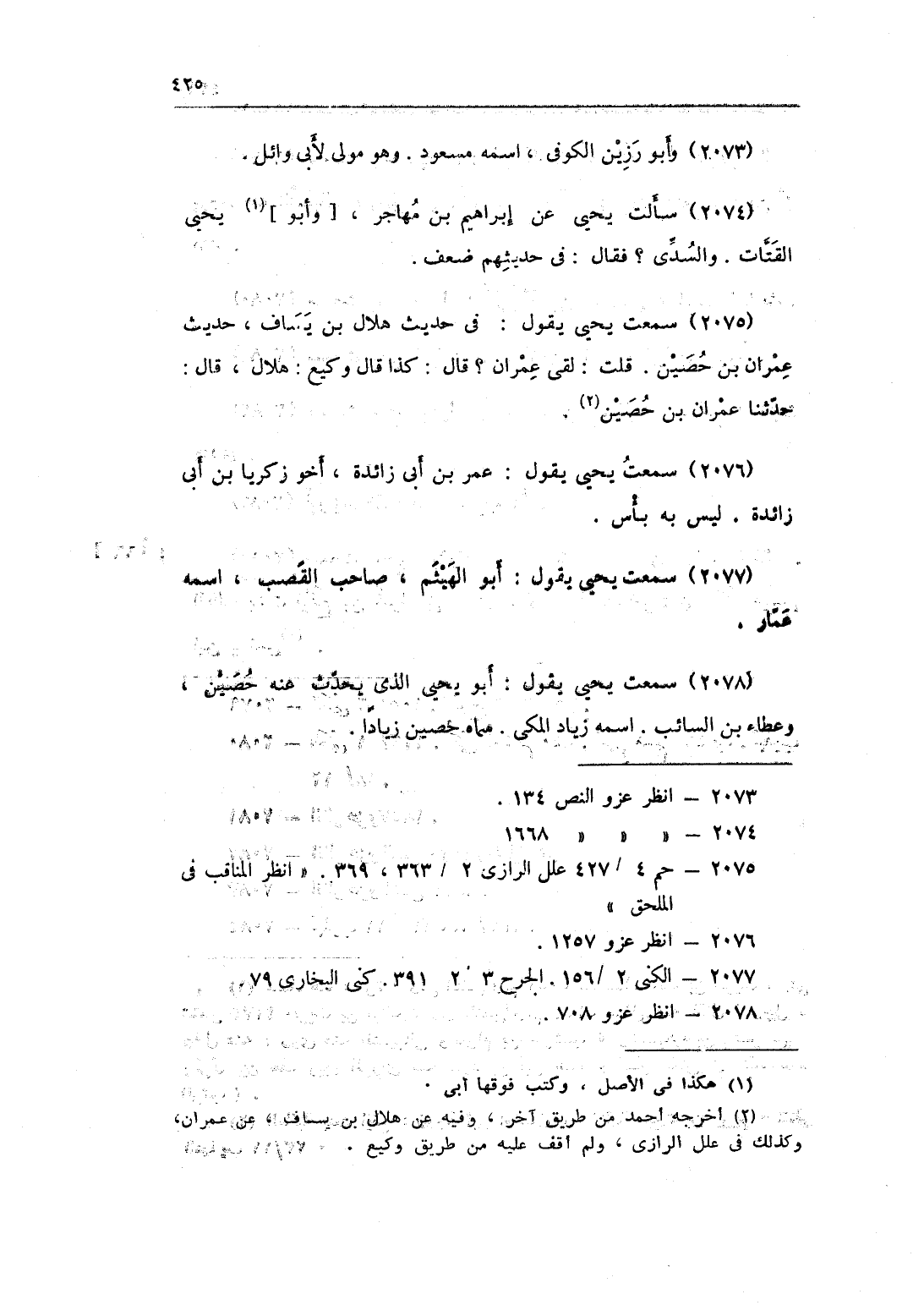 2075 - سَمِعت يحيى يَقُول فِي حَدِيث هِلَال بن يسَاف حَدِيث عمرَان بن حُصَيْن قلت لقى عمرَان قَالَ كَذَا قَالَ وَكِيع هِلَال قَالَ حَدثنَا عمرَان بن حُصَيْن