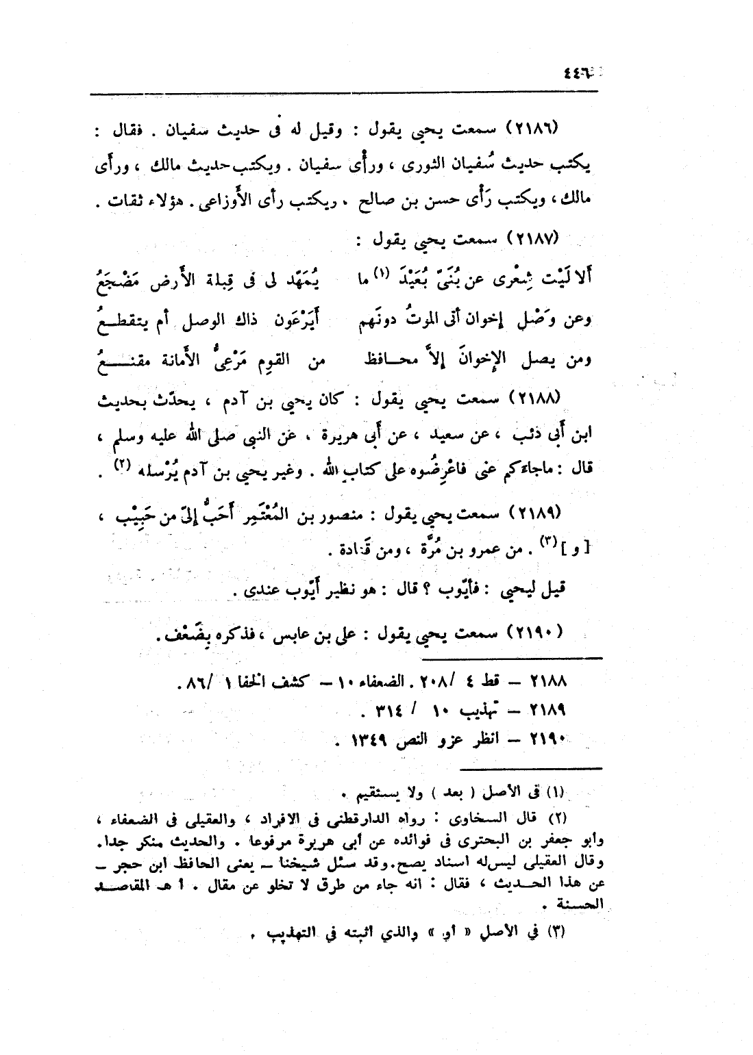 2187 - سَمِعت يحيى يَقُول ... أَلا لَيْت شعري عَن بني بعيد مَا ... يمهد لي فِي قبْلَة الأَرْض مَضْجَع ... ... وَعَن وصل إخْوَان أَتَى الْمَوْت دونهم ... أيرعون ذَاك الْوَصْل أم يتقطع ... ... وَمن يصل الإخوان إِلَّا محافظ ... من الْقَوْم مرعي الْأَمَانَة مقنع ...