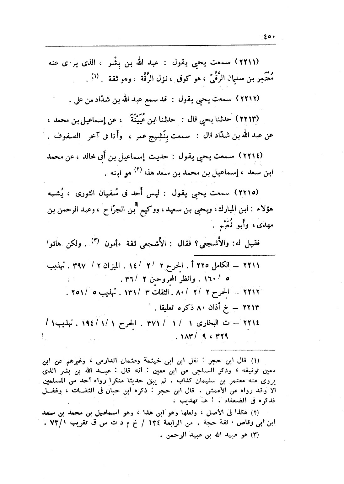 2215 - سَمِعت يحيى يَقُول لَيْسَ أحد فِي سُفْيَان الثَّوْريّ يشبه هَؤُلَاءِ بن الْمُبَارك وَيحيى بن سعيد ووكيع بن الْجراح وَعبد الرَّحْمَن بن مهْدي وَأَبُو نعيم فَقيل لَهُ والأشجعي فَقَالَ الْأَشْجَعِيّ ثِقَة مَأْمُون وَلَكِن هاتوا من يروي عَنهُ قَالَ يحيى وَبعد هَؤُلَاءِ فِي سُفْيَان يحيى بن آدم وَعبيد الله بن مُوسَى وَأَبُو أَحْمد الزبيرِي وَأَبُو حُذَيْفَة وَقبيصَة وَمُعَاوِيَة بن الْقصار وَالْفِرْيَابِي قلت لَهُ فَأَبُو دَاوُد الْحَفرِي قَالَ أَبُو دَاوُد الْحَفرِي رجل صَالح