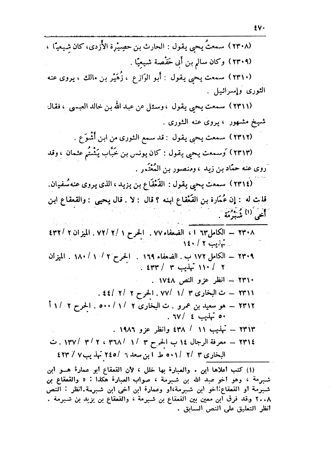 2314 - سَمِعت يحيى يَقُول الْقَعْقَاع بن يزِيد الَّذِي يروي عَنهُ سُفْيَان قلت لَهُ إِن عمَارَة بن الْقَعْقَاع ابْنه قَالَ لَا قَالَ يحيى والقعقاع بن أخي شبْرمَة