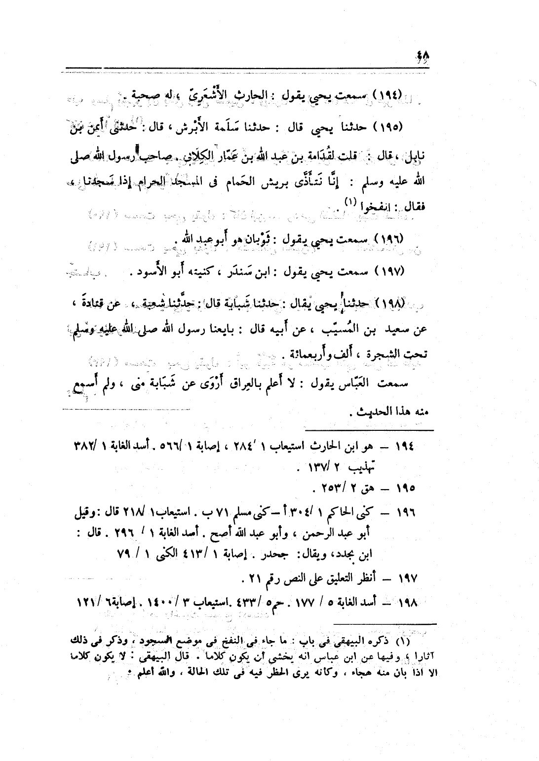 195 - حَدثنَا يحيى قَالَ حَدثنَا سَلمَة الأبرش قَالَ حَدثنِي أَيمن بن نابل قَالَ قلت لقدامة بن عبد الله بن عمار الْكلابِي صَاحب رَسُول الله صلى الله عَلَيْهِ وَسلم إِنَّا نتأذى بريش الْحمام فِي الْمَسْجِد الْحَرَام إِذا سجدنا فَقَالَ انفخوا