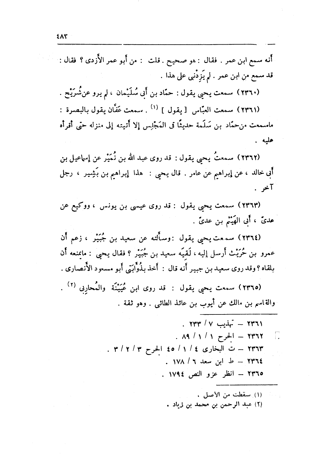 2364 - سَمِعت يحيى يَقُول وَسَأَلته عَن سعيد بن جُبَير زعم أَن عَمْرو بن حُرَيْث أرسل إِلَيْهِ لقِيه سعيد بن جُبَير فَقَالَ يحيى مَا يمنعهُ أَن يلقاه وَقد روى سعيد بن جُبَير أَنه قَالَ أَخذ بذؤابتي أَبُو مَسْعُود الْأنْصَارِيّ