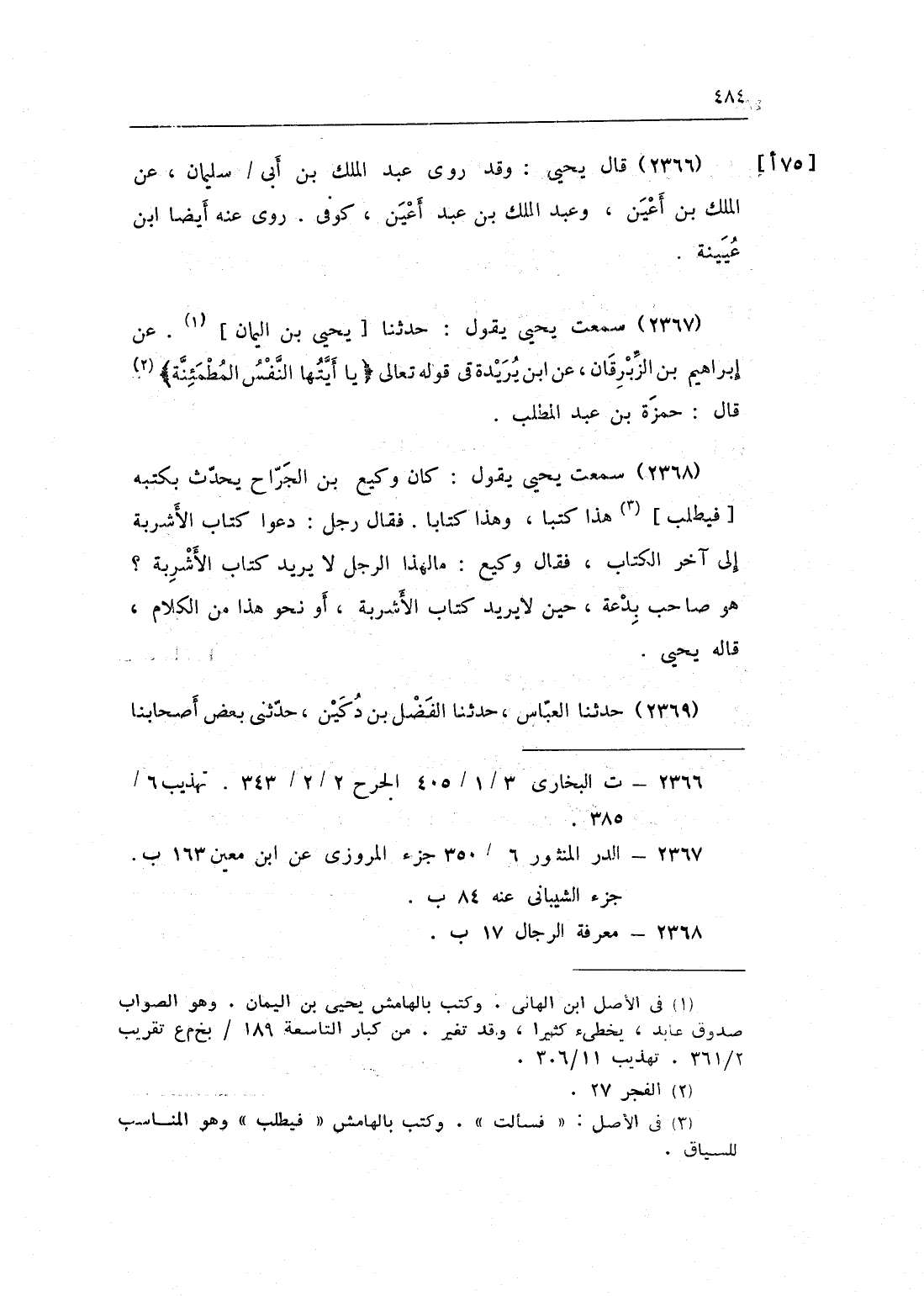 2367 - سَمِعت يحيى يَقُول حَدثنَا يحيى بن الْيَمَان عَن إِبْرَاهِيم بن الزبْرِقَان عَن بن بُرَيْدَة فِي قَوْله تَعَالَى يَا أيتها النَّفس المطمئنة قَالَ حَمْزَة بن عبد الْمطلب