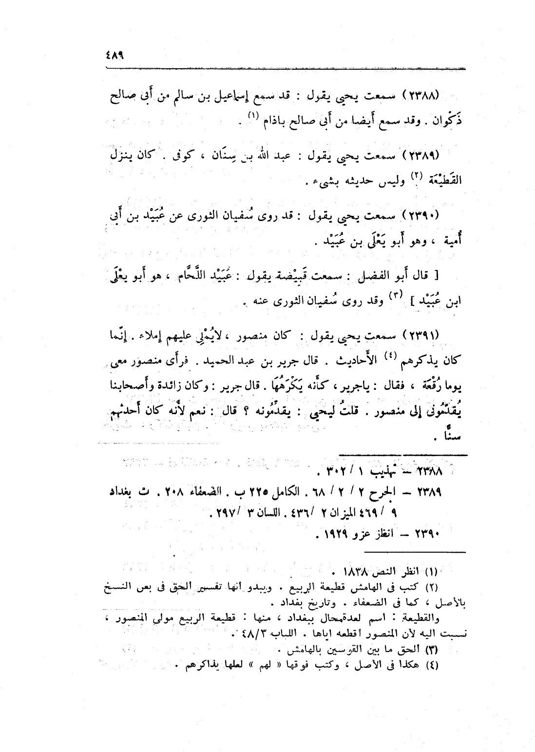 2390 - سَمِعت يحيى يَقُول قد روى سُفْيَان الثَّوْريّ عَن عبيد بن أبي أُميَّة وَهُوَ أَبُو يعلى بن عبيد قَالَ أَبُو الْفضل سَمِعت قبيصَة يَقُول عبيد اللحام هُوَ أَبُو يعلى بن عبيد وَقد روى سُفْيَان الثَّوْريّ عَنهُ