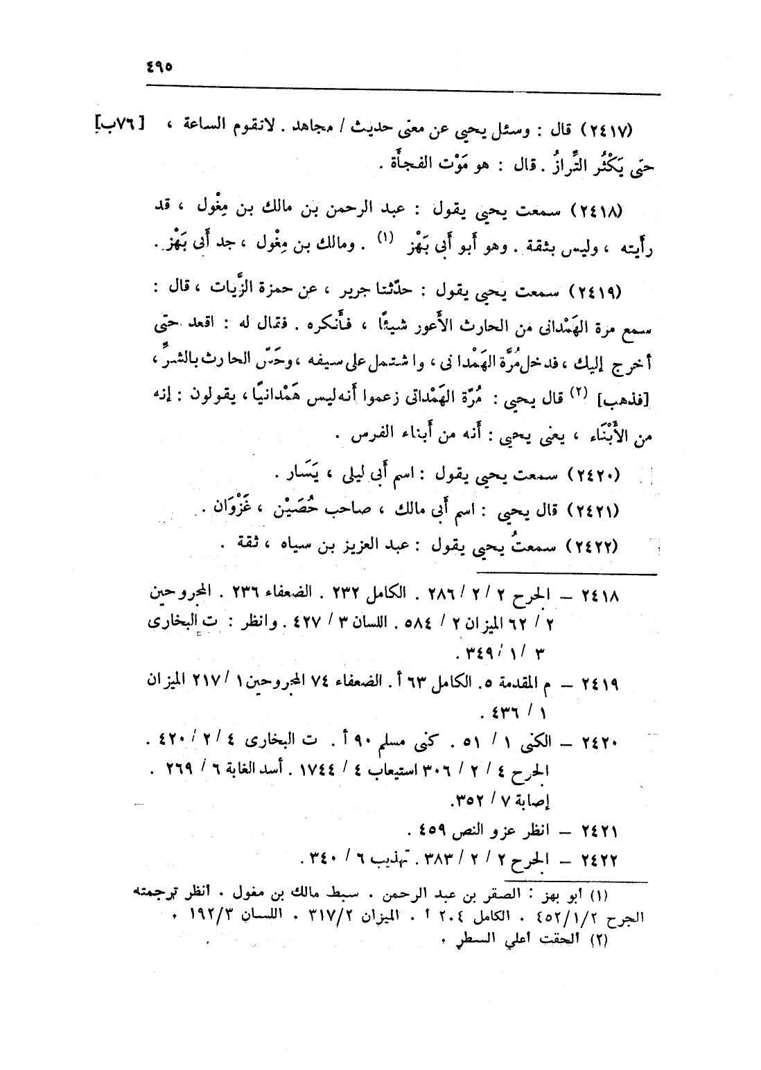 2419 - سَمِعت يحيى يَقُول حَدثنَا جرير عَن حَمْزَة الزيات قَالَ سمع مرّة الْهَمدَانِي من الْحَارِث الْأَعْوَر شَيْئا فَأنكرهُ فَقَالَ لَهُ اقعد حَتَّى أخرج إِلَيْك فَدخل مرّة الْهَمدَانِي واشتمل على سَيْفه وحس الْحَارِث بِالشَّرِّ فَذهب قَالَ يحيى مرّة الْهَمدَانِي زَعَمُوا أَنه لَيْسَ همدانيا يَقُولُونَ إِنَّه من الْأَبْنَاء يَعْنِي يحيى أَنه من أَبنَاء الْفرس