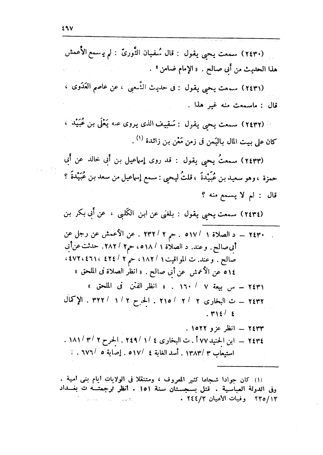 2430 - سَمِعت يحيى يَقُول قَالَ سُفْيَان الثَّوْريّ لم يسمع الْأَعْمَش هَذَا الحَدِيث من أبي صَالح الإِمَام ضَامِن
