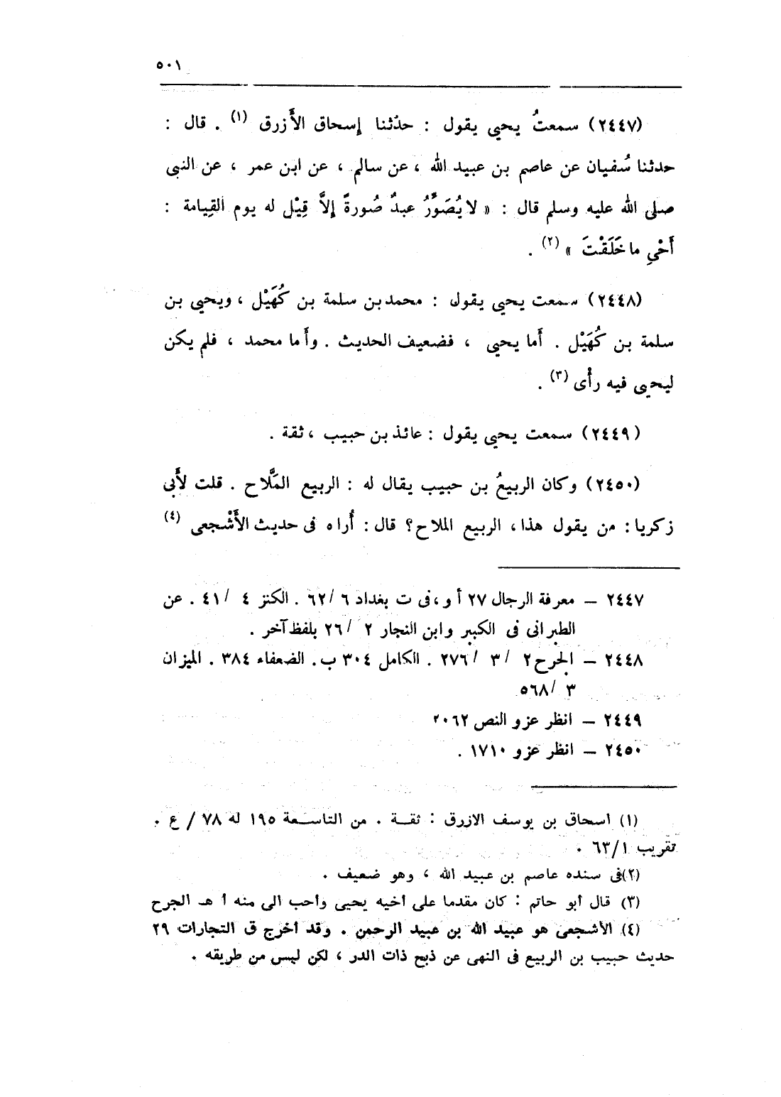 2450 - وَكَانَ الرّبيع بن حبيب يُقَال لَهُ الرّبيع الملاح قلت لأبي زَكَرِيَّا من يَقُول هَذَا الرّبيع الملاح قَالَ أرَاهُ فِي حَدِيث الْأَشْجَعِيّ