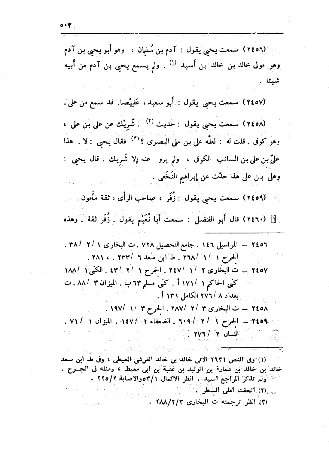 2456 - سَمِعت يحيى يَقُول آدم بن سُلَيْمَان وَهُوَ أَبُو يحيى بن آدم وَهُوَ مولى خَالِد بن خَالِد بن أسيد وَلم يسمع يحيى بن آدم من أَبِيه شَيْئا