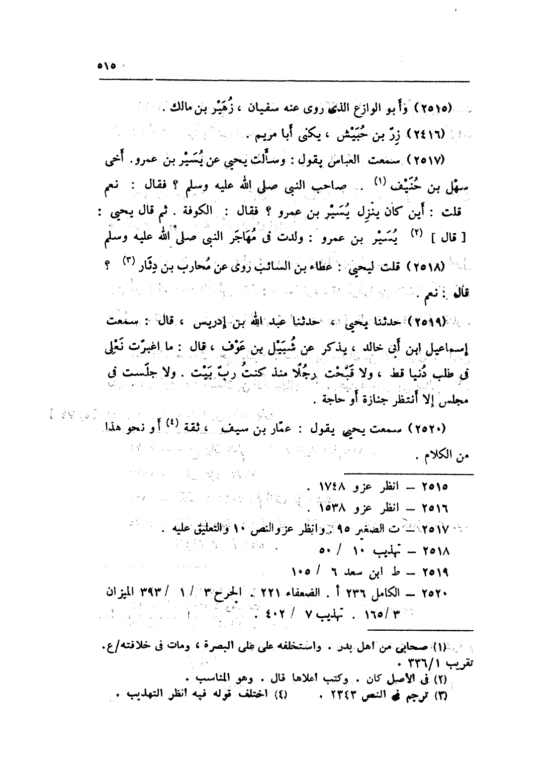 2517 - سَمِعت الْعَبَّاس يَقُول وَسَأَلت يحيى عَن يسير بن عَمْرو أخي سهل بن حنيف صَاحب النَّبِي صلى الله عَلَيْهِ وَسلم فَقَالَ نعم قلت أَيْن كَانَ ينزل يسير بن عَمْرو فَقَالَ الْكُوفَة ثمَّ قَالَ يحيى قَالَ يسير بن عَمْرو ولدت فِي مهَاجر النَّبِي صلى الله عَلَيْهِ وَسلم