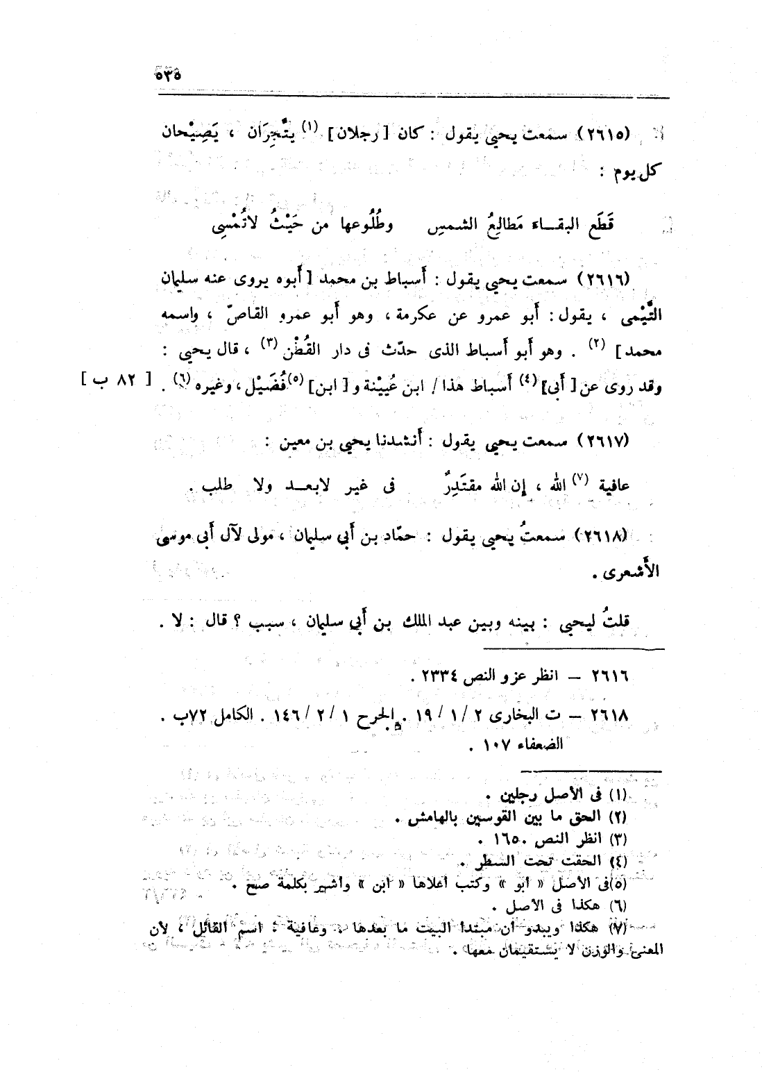 2616 - سَمِعت يحيى يَقُول أَسْبَاط بن مُحَمَّد أَبوهُ يرْوى عَنهُ سُلَيْمَان التَّيْمِيّ يَقُول أَبُو عَمْرو عَن عِكْرِمَة وَهُوَ أَبُو عَمْرو الْقَاص واسْمه مُحَمَّد وَهُوَ أَبُو أَسْبَاط الَّذِي حدث فِي دَار الْقطن قَالَ يحيى وَقد روى عَن أبي أَسْبَاط هَذَا بن عُيَيْنَة وَابْن فُضَيْل وَغَيره