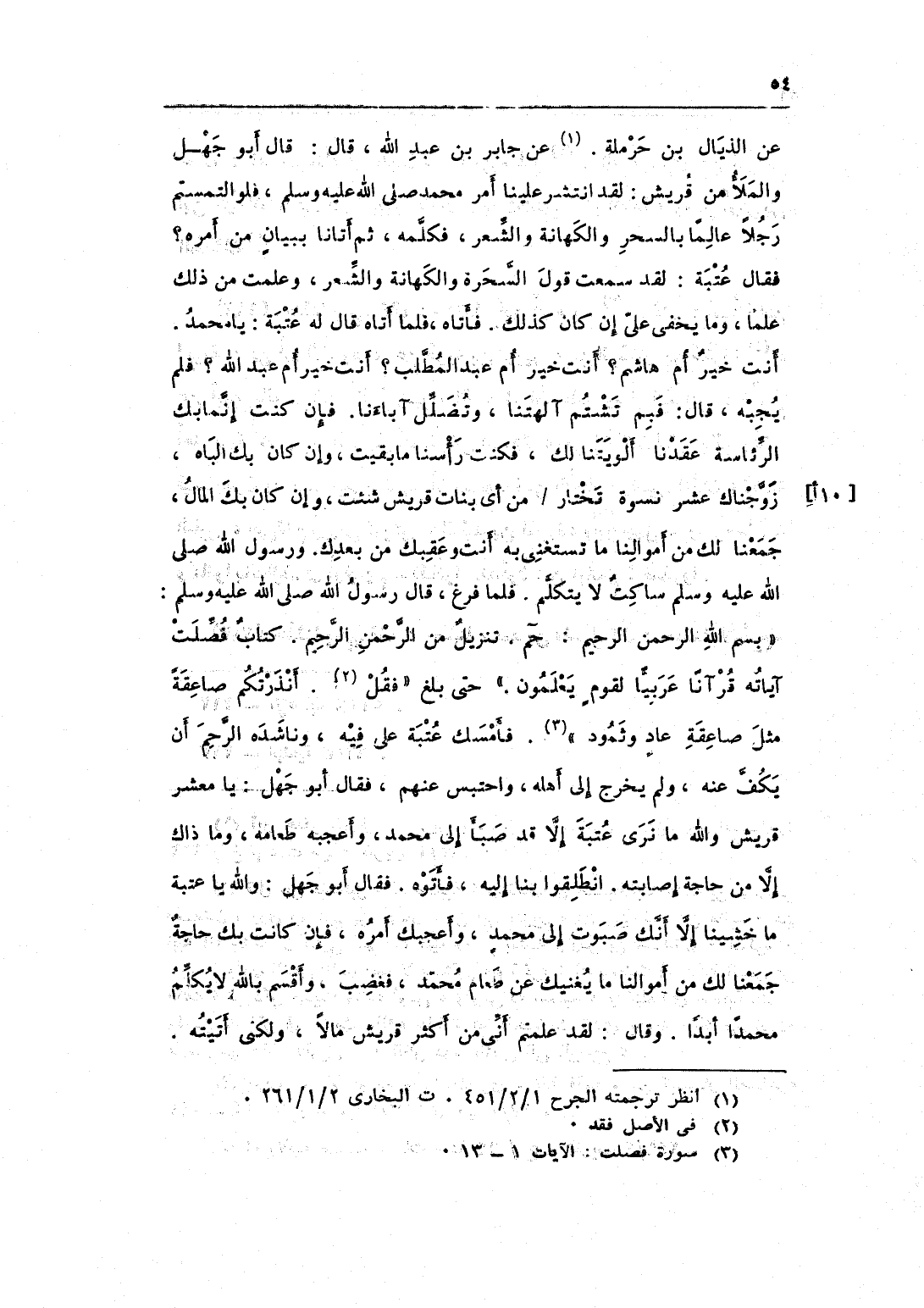 عَن الذَّيَّال بن حَرْمَلَة عَن جَابر بن عبد الله قَالَ قَالَ أَبُو جهل وَالْمَلَأ من قُرَيْش لقد إنتشر علينا أَمر مُحَمَّد صلى الله عَلَيْهِ وَسلم فَلَو الْتَمَسْتُمْ رجلا عَالما بِالسحرِ وَالْكهَانَة وَالشعر فَكَلمهُ ثمَّ أَتَانَا بِبَيَان من أمره فَقَالَ عتبَة لقد سَمِعت قَول السَّحَرَة وَالْكهَانَة وَالشعر وَعلمت من ذَلِك علما وَمَا يخفى على إِن كَانَ كَذَلِك فَأَتَاهُ فَلَمَّا أَتَاهُ قَالَ لَهُ عتبَة يَا مُحَمَّد أَنْت خير أم هَاشم أَنْت خير أم أَنْت عبد الْمطلب أَنْت خير أم عبد الله فَلم يجبهُ قَالَ فَبِمَ تَشْتُم آلِهَتنَا وتضلل آبَاءَنَا فَإِن كنت إِنَّمَا بك الرِّئَاسَة عَقدنَا ألويتنا لَك فَكنت رَأْسنَا مَا بقيت وَإِن كَانَ بك الباه زَوَّجْنَاك عشر نسْوَة تخْتَار من أَي بَنَات قُرَيْش شِئْت وَإِن كَانَ بك المَال جَمعنَا لَك من أَمْوَالنَا مَا تَسْتَغْنِي بِهِ أَنْت وَعَقِبك من بعْدك وَرَسُول الله صلى الله عَلَيْهِ وَسلم سَاكِت لَا يتَكَلَّم فَلَمَّا فرغ قَالَ رَسُول الله صلى الله عَلَيْهِ وَسلم بِسم الله الرَّحْمَن الرَّحِيم حم تَنْزِيل من الرَّحْمَن الرَّحِيم كتاب فصلت آيَاته قُرْآنًا عَرَبيا لقوم يعلمُونَ حَتَّى بلغ فَقل أَنْذَرْتُكُمْ صَاعِقَة مثل صَاعِقَة عَاد وَثَمُود فَأمْسك عتبَة على فِيهِ وَنَاشَدَهُ الرَّحِم أَن يكف عَنهُ وَلم يخرج إِلَى أَهله وَاحْتبسَ عَنْهُم فَقَالَ أَبُو جهل يَا معشر قُرَيْش وَالله مَا نرى عتبَة إِلَّا قد صَبأ إِلَى مُحَمَّد وَأَعْجَبهُ طَعَامه وَمَا ذَاك إِلَّا من حَاجَة إِصَابَته انْطَلقُوا بِنَا إِلَيْهِ فَأتوهُ فَقَالَ أَبُو جهل وَالله يَا عتبَة مَا خشينا إِلَّا أَنَّك صبوت إِلَى مُحَمَّد وَأَعْجَبَك أمره فَإِن كَانَت بك حَاجَة جَمعنَا لَك من أَمْوَالنَا مَا يُغْنِيك عَن طَعَام مُحَمَّد فَغَضب وَأقسم بِاللَّه لَا يكلم مُحَمَّدًا أبدا وَقَالَ لقد علمْتُم أَنى من أَكثر قُرَيْش مَالا وَلَكِنِّي أَتَيْته فَقص عَلَيْهِم الْقِصَّة فأجابنى بِشَيْء وَالله مَا هُوَ بِسحر وَلَا شعر وَلَا كهَانَة قَرَأَ بِسم الله الرَّحْمَن الرَّحِيم حم تَنْزِيل من الرَّحْمَن الرَّحِيم كتاب فصلت آيَاته قُرْآنًا عَرَبيا لقوم يعلمُونَ حَتَّى بلغ فَقل أَنْذَرْتُكُمْ صَاعِقَة مثل صَاعِقَة عَاد وَثَمُود فَأَمْسَكت بِفِيهِ وَنَاشَدْته الرَّحِم أَن يكف وَقد علمْتُم أَن مُحَمَّدًا إِذا قَالَ شَيْئا لم يكذب فَخفت أَن ينزل بكم الْعَذَاب