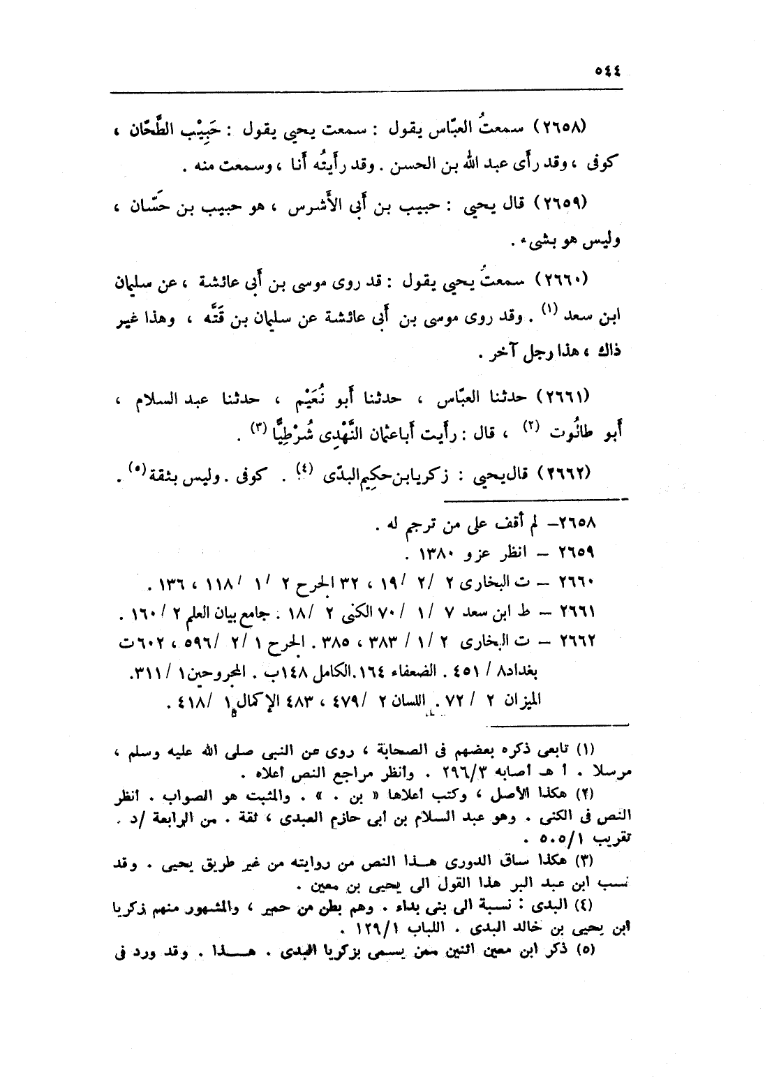 2658 - سَمِعت الْعَبَّاس يَقُول سَمِعت يحيى يَقُول حبيب الطَّحَّان كُوفِي وَقد رأى عبد الله بن الْحسن وَقد رَأَيْته أَنا وَسمعت مِنْهُ