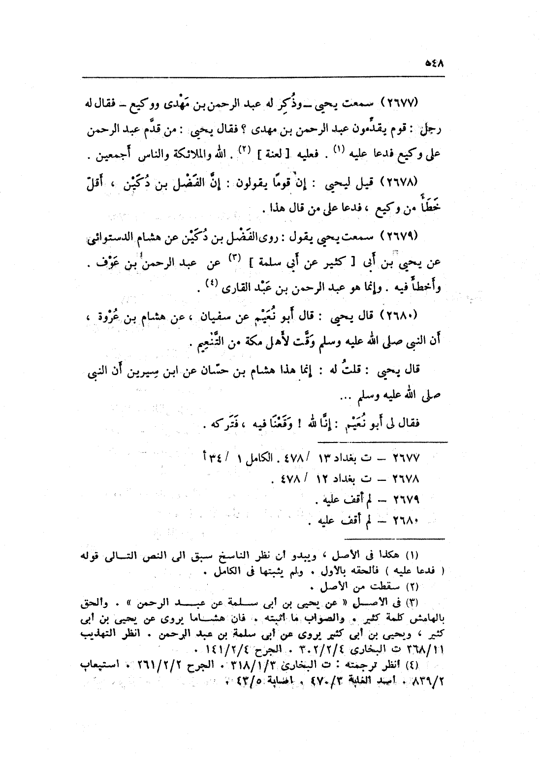 2677 - سَمِعت يحيى وَذكر لَهُ عبد الرَّحْمَن بن مهْدي ووكيع فَقَالَ لَهُ رجل قوم يقدمُونَ عبد الرَّحْمَن بن مهْدي فَقَالَ يحيى من قدم عبد الرَّحْمَن على وَكِيع فَدَعَا عَلَيْهِ فَعَلَيهِ لعنة الله وَالْمَلَائِكَة وَالنَّاس أَجْمَعِينَ