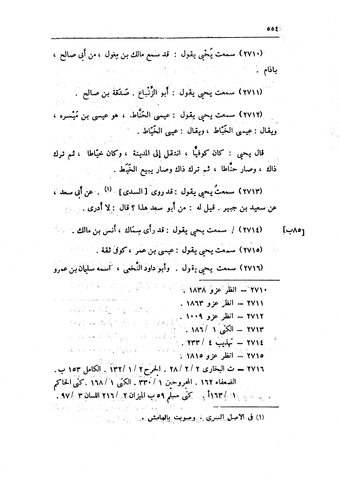 2712 - سَمِعت يحيى يَقُول عِيسَى الحناط هُوَ عِيسَى بن ميسره وَيُقَال عِيسَى الخباط وَيُقَال عِيسَى الْخياط قَالَ يحيى كَانَ كوفيا انْتقل إِلَى الْمَدِينَة وَكَانَ خياطا ثمَّ ترك ذَاك وَصَارَ حناطا ثمَّ ترك ذَاك وَصَارَ يَبِيع الْخَيط