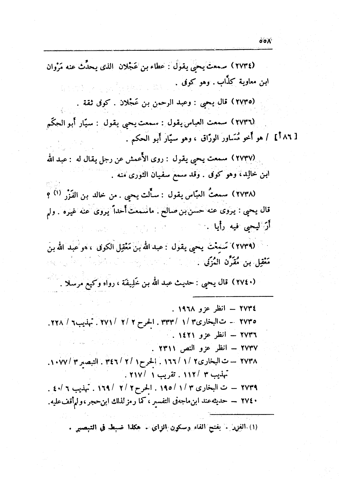 2738 - سَمِعت الْعَبَّاس يَقُول سَأَلت يحيى من خَالِد بن الفزر قَالَ يحيى يرْوى عَنهُ حسن بن صَالح مَا سَمِعت أحدا يرْوى عَنهُ غَيره وَلم أر ليحيى فِيهِ رَأيا