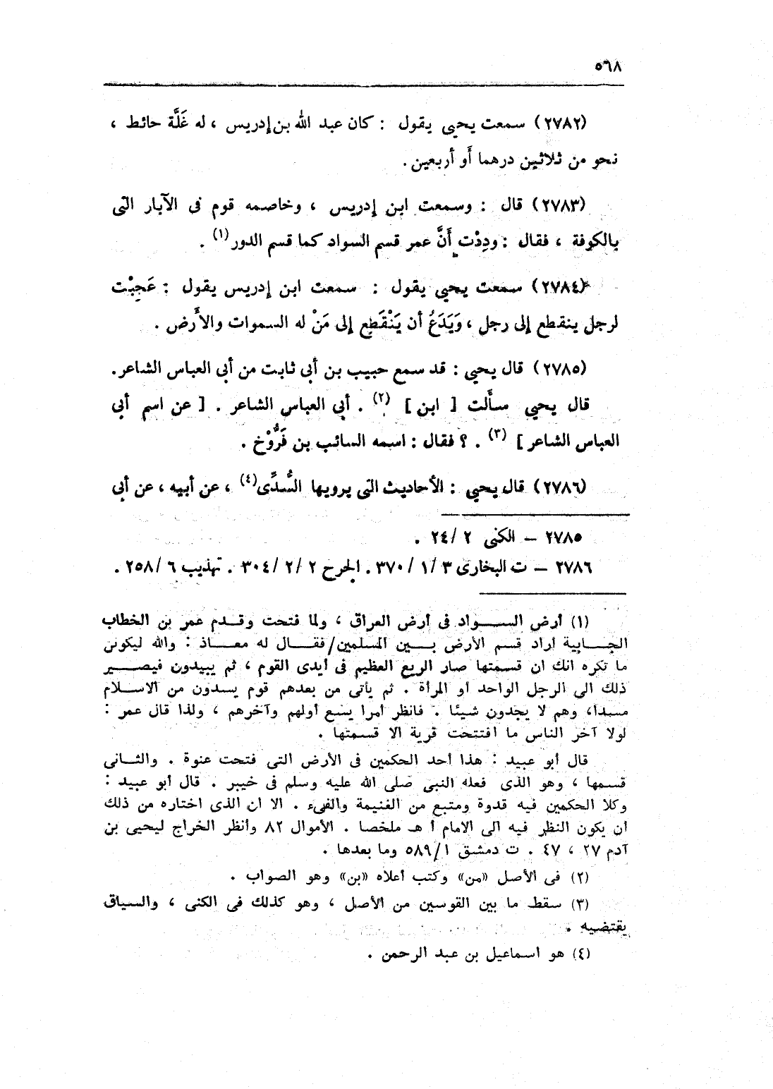 2785 - قَالَ يحيى قد سمع حبيب بن أبي ثَابت من أبي الْعَبَّاس الشَّاعِر قَالَ يحيى سَأَلت بن أبي الْعَبَّاس الشَّاعِر عَن اسْم أبي الْعَبَّاس الشَّاعِر فَقَالَ اسْمه السَّائِب بن فروخ