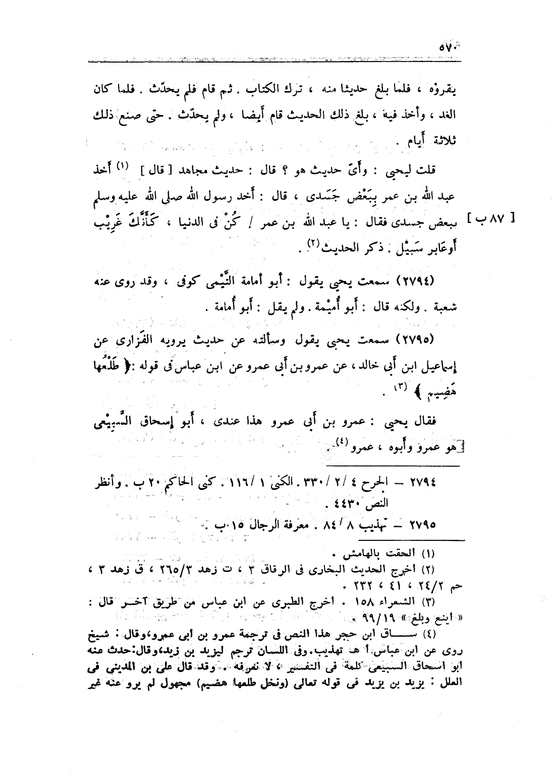 2795 - سَمِعت يحيى يَقُول وَسَأَلته عَن حَدِيث يرويهِ الْفَزارِيّ عَن إِسْمَاعِيل بن أَبى خَالِد عَن عَمْرو بن أَبى عَمْرو عَن بن عَبَّاس فِي قَوْله طلعها هضيم فَقَالَ يحيى عَمْرو بن أَبى عَمْرو هَذَا عِنْدِي أَبُو إِسْحَاق السبيعِي هُوَ عَمْرو وَأَبوهُ عَمْرو قلت ليحيى هُوَ عَمْرو بن أَبى عَمْرو الْمدنِي قَالَ لَا