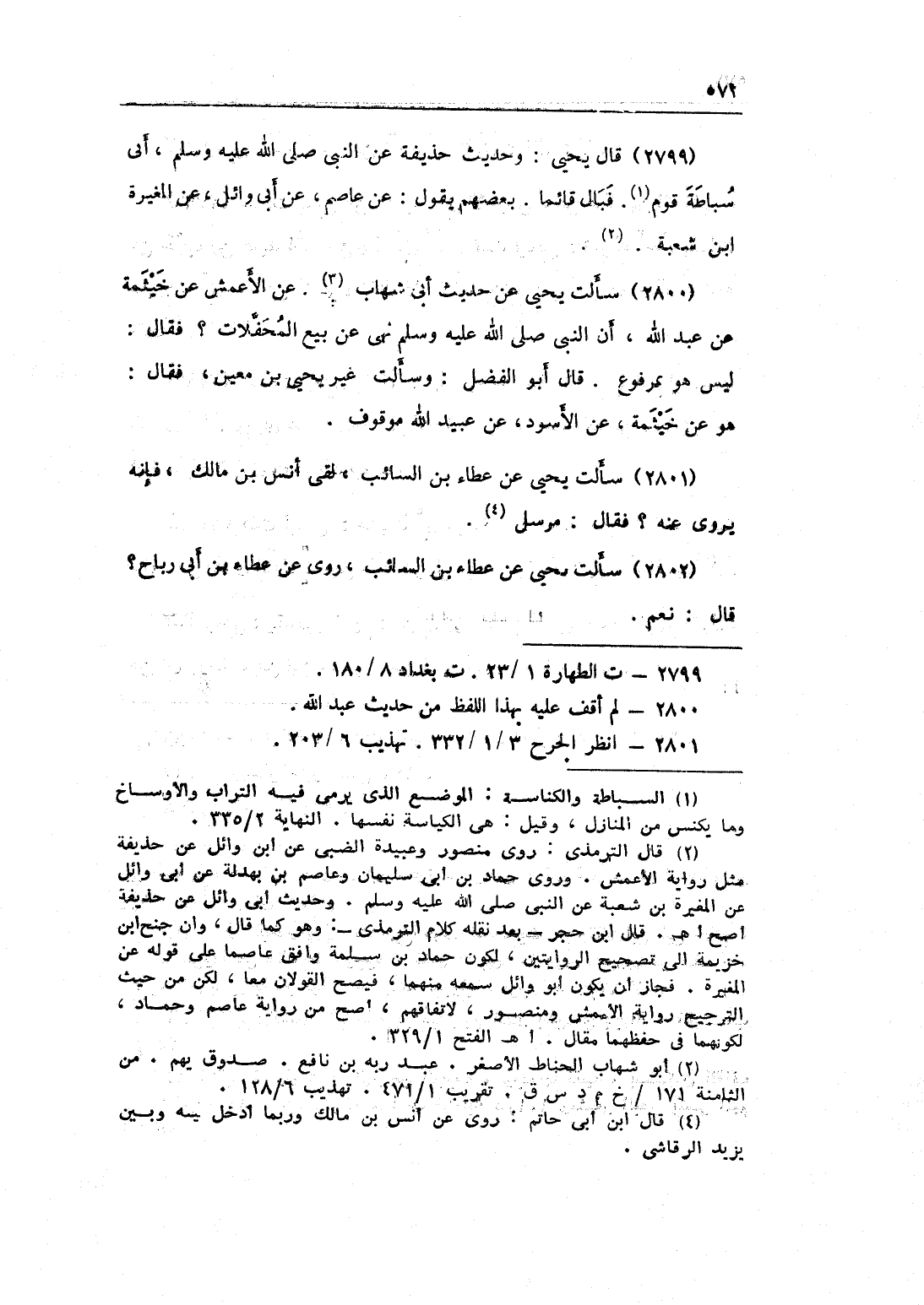2799 - قَالَ يحيى وَحَدِيث حُذَيْفَة عَن النَّبِي صلى الله عَلَيْهِ وَسلم أَبى سباطة قوم فَبَال قَائِما بَعضهم يَقُول عَن عَاصِم عَن أَبى وَائِل عَن الْمُغيرَة بن شُعْبَة