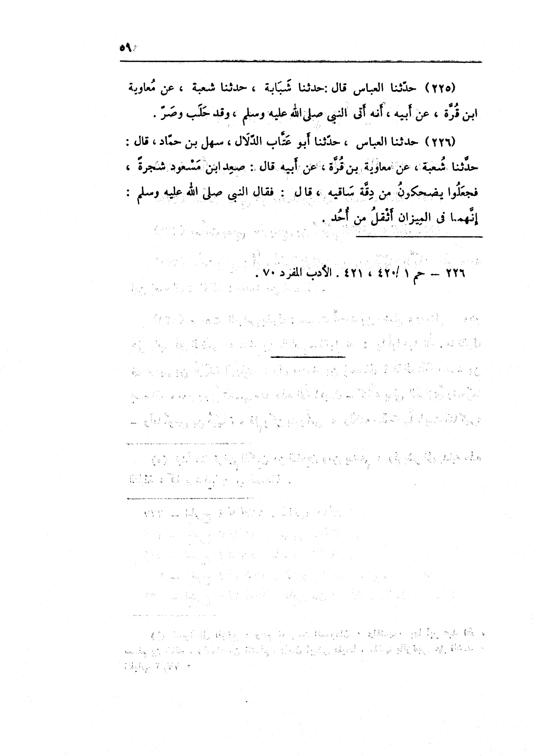 226 - حَدثنَا الْعَبَّاس حَدثنَا أَبُو عتاب الدَّلال سهل بن حَمَّاد قَالَ حَدثنَا شُعْبَة عَن مُعَاوِيَة بن قُرَّة عَن أَبِيه قَالَ صعد بن مَسْعُود شَجَرَة فَجعلُوا يَضْحَكُونَ من دقة سَاقيه قَالَ فَقَالَ النَّبِي صلى الله عَلَيْهِ وَسلم إنَّهُمَا فِي الْمِيزَان أثقل من أحد
