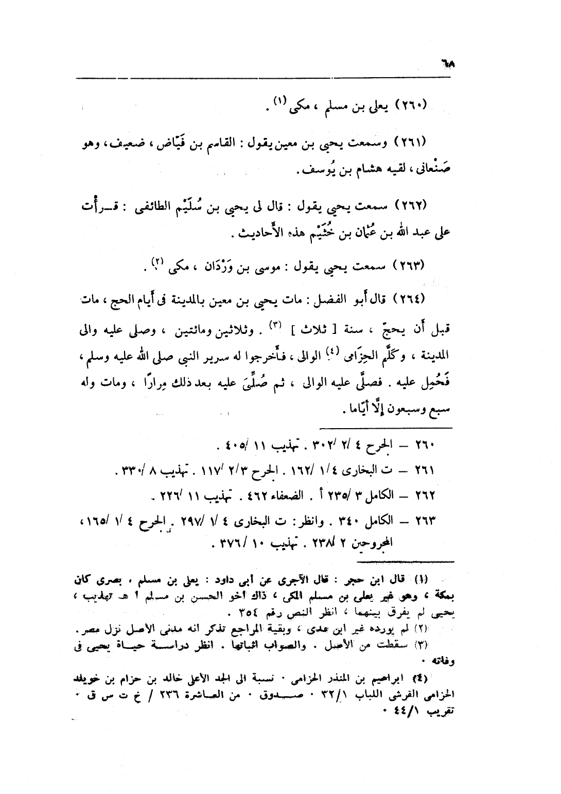 264 - قَالَ أَبُو الْفضل مَاتَ يحيى بن معِين بِالْمَدِينَةِ فِي أَيَّام الْحَج مَاتَ قبل أَن يحجّ سنة ثَلَاث وَثَلَاثِينَ وَمِائَتَيْنِ وَصلى عَلَيْهِ والى الْمَدِينَة وكلم الحزامى الوالى فأخرجوا لَهُ سَرِير النَّبِي صلى الله عَلَيْهِ وَسلم فَحمل عَلَيْهِ فصلى عَلَيْهِ الْوَالِي ثمَّ صلى عَلَيْهِ بعد ذَلِك مرَارًا وَمَات وَله سبع وَسَبْعُونَ إِلَّا أَيَّامًا
