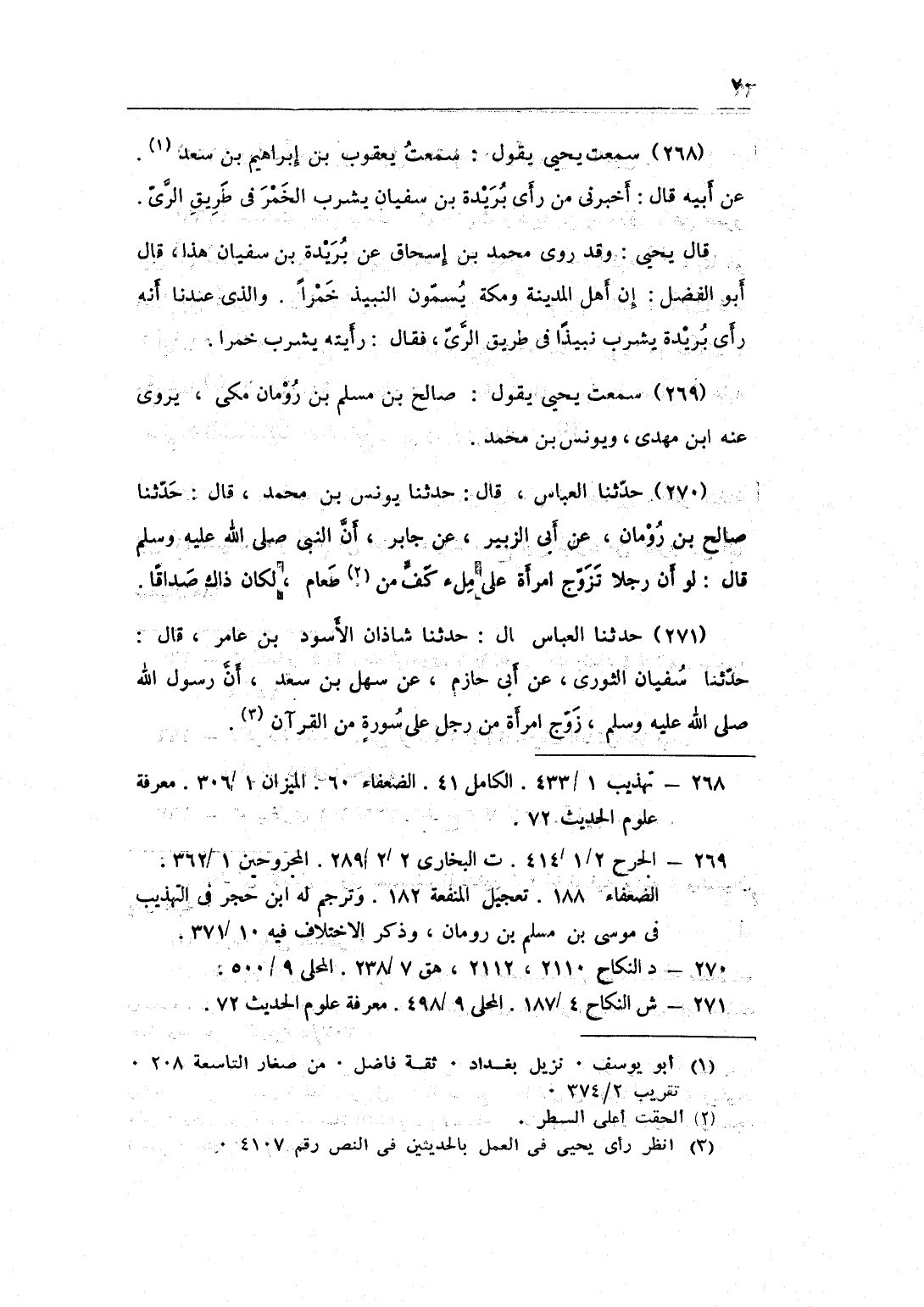 268 - سَمِعت يحيى يَقُول سَمِعت يَعْقُوب بن إِبْرَاهِيم بن سعد عَن أَبِيه قَالَ أَخْبرنِي من رأى بُرَيْدَة بن سُفْيَان يشرب الْخمر فِي طَرِيق الرّيّ قَالَ يحيى وَقد روى مُحَمَّد بن إِسْحَاق عَن بُرَيْدَة بن سُفْيَان هَذَا قَالَ أَبُو الْفضل إِن أهل الْمَدِينَة وَمَكَّة يسمون النَّبِيذ خمرًا وَالَّذِي عندنَا أَنه رأى بُرَيْدَة يشرب نبيذا فِي طَرِيق الرّيّ فَقَالَ رَأَيْته يشرب خمرًا