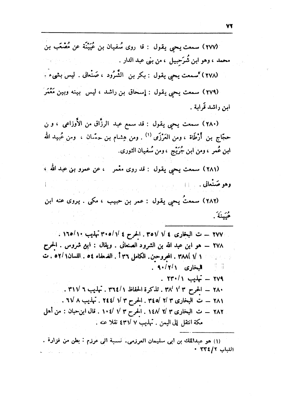 280 - سَمِعت يحيى يَقُول قد سمع عبد الرَّزَّاق من الْأَوْزَاعِيّ وَمن حجاج بن أَرْطَاة وَمن الْعَرْزَمِي وَمن هِشَام بن حسان وَمن عبيد الله بن عمر وَمن بن جريج وَمن سُفْيَان الثَّوْريّ