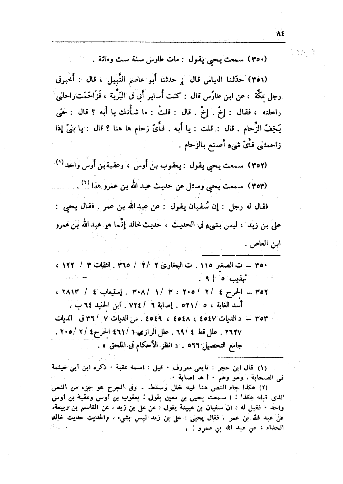 353 - سَمِعت يحيى وَسُئِلَ عَن حَدِيث عبد الله بن عَمْرو هَذَا فَقَالَ لَهُ رجل إِن سُفْيَان يَقُول عَن عبد الله بن عمر قَالَ يحيى على بن زيد لَيْسَ بِشَيْء فِي الحَدِيث حَدِيث خَالِد إِنَّمَا هُوَ عبد الله بن عَمْرو بن الْعَاصِ